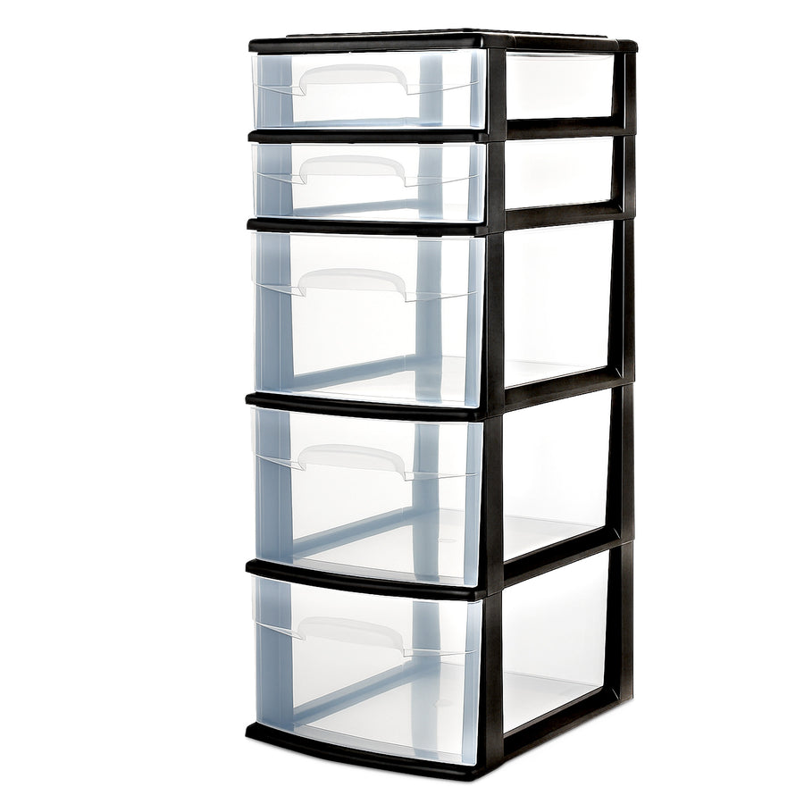 Homz Plastic 5 Drawer Storage Container Tower with Clear Drawers/Black Frame
