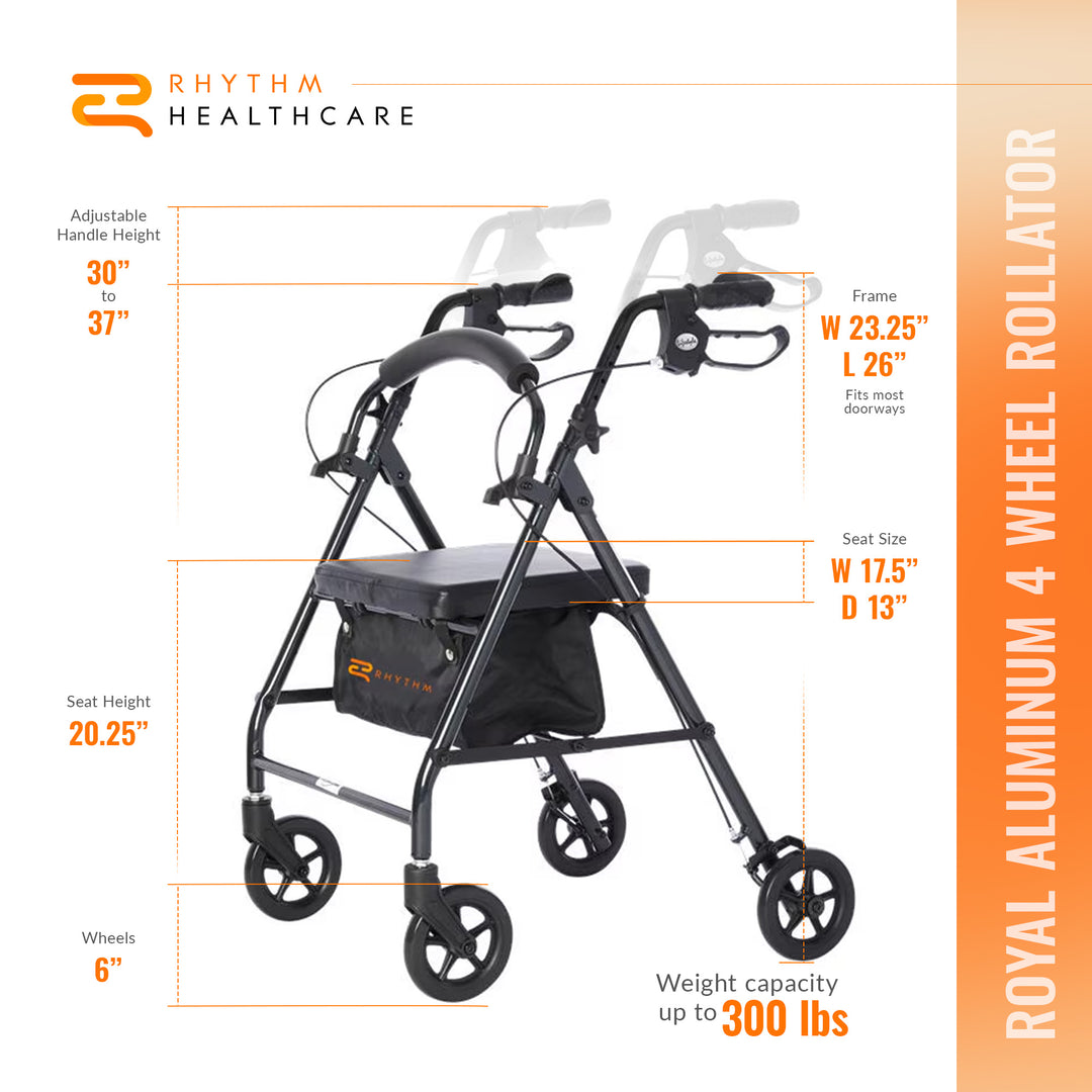 Rhythm Healthcare is dedicated to providing trusted solutions for mobility, crafted to bring independence and comfort to daily living. The Royal Aluminum 4 Wheel Rollator embodies this commitment by offering practical design features, dependable construction, and user-focused innovation for seniors and caregivers alike.