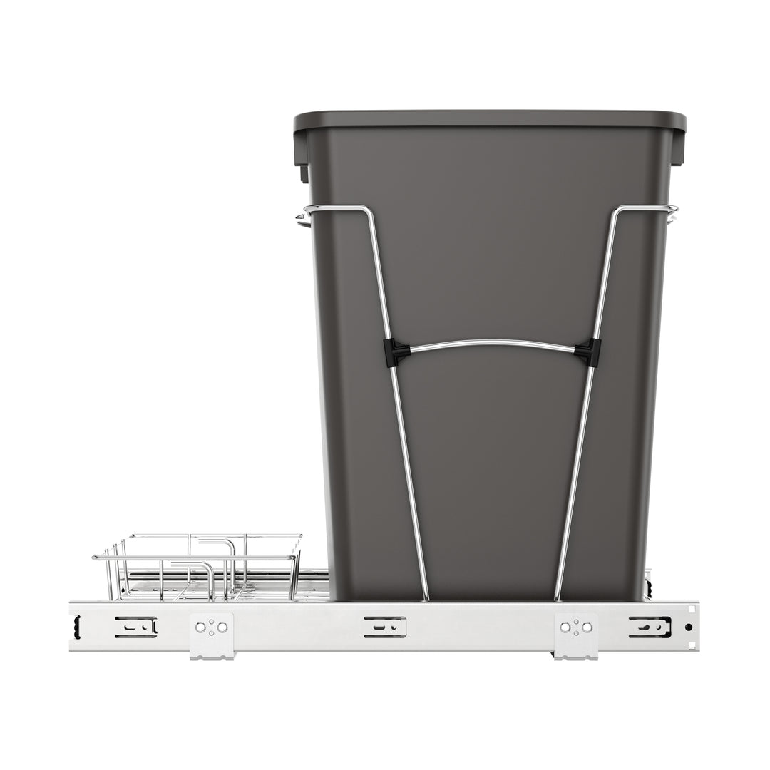 Once installation is complete, this sliding trash container glides effortlessly on a 3-piece zinc plated full-extension ball-bearing slide system. This pullout bin uses a standard 12-gallon trash bag and has a rear basket for extra storage that can be removed to reduce the overall depth to 18-inches. Designed for a 15β base cabinet with an opening width of 11β or wider. The heavy gage plated metal wire construction ensures that this pullout system will last for years to come.