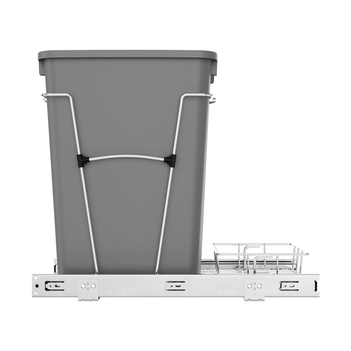 Once installation is complete, this sliding trash container glides effortlessly on a 3-piece zinc plated full-extension ball-bearing slide system. This pullout bin uses a standard 12-gallon trash bag and has a rear basket for extra storage that can be removed to reduce the overall depth to 18-inches. Designed for a 15” base cabinet with an opening width of 11” or wider. The heavy gage plated metal wire construction ensures that this pullout system will last for years to come.