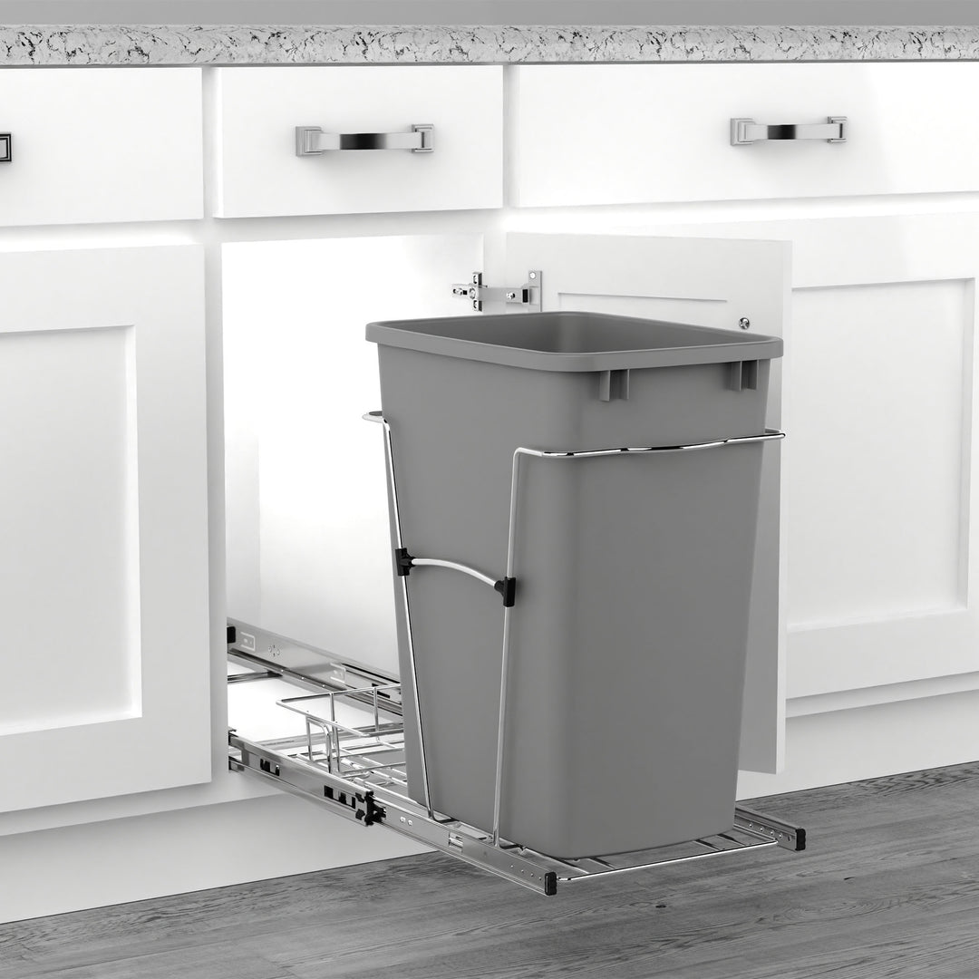Featuring a large capacity, you'll spend more time enjoying your clean kitchen and less time taking out the waste or recycling items. This space-saving trash container system comes with all the hardware you need to install it easily and quickly to the cabinet floor. Rev-A-Shelf knows waste containers better than anyone in our industry and the RV series is perfect for anyone wanting to replace your existing floor standing trash can and create more space in your kitchen.