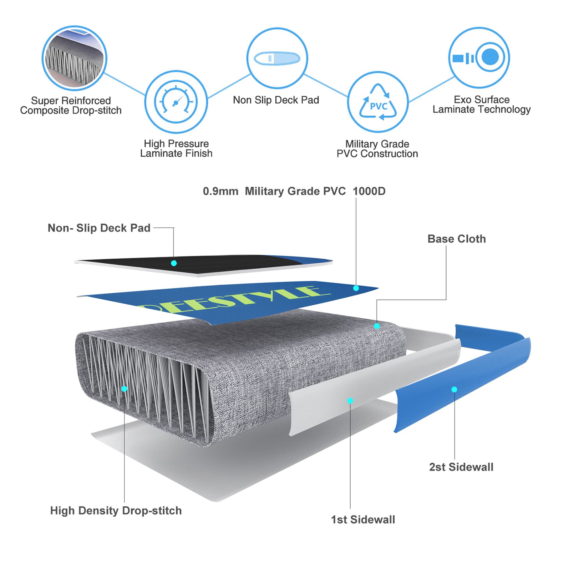 • Durable PVC construction with a drop-stitch inner structure maintains its shape and has a non-slip deck for added safety