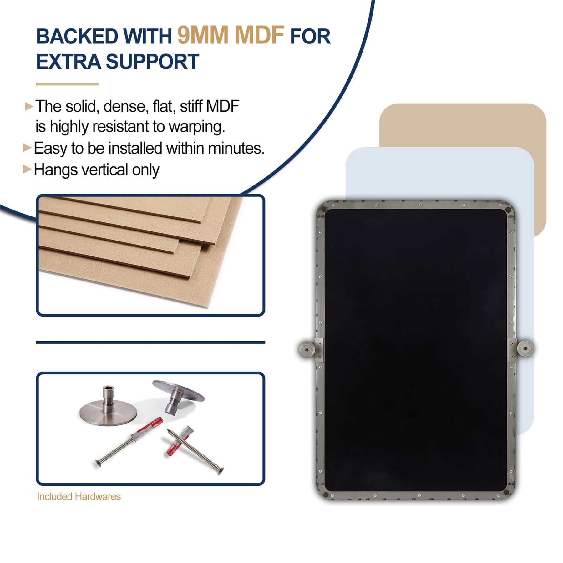 • Premium construction features high-quality stainless steel, no-distortion 4MM HD floating glass, 9mm MDF backboard, and sturdy wall brackets
