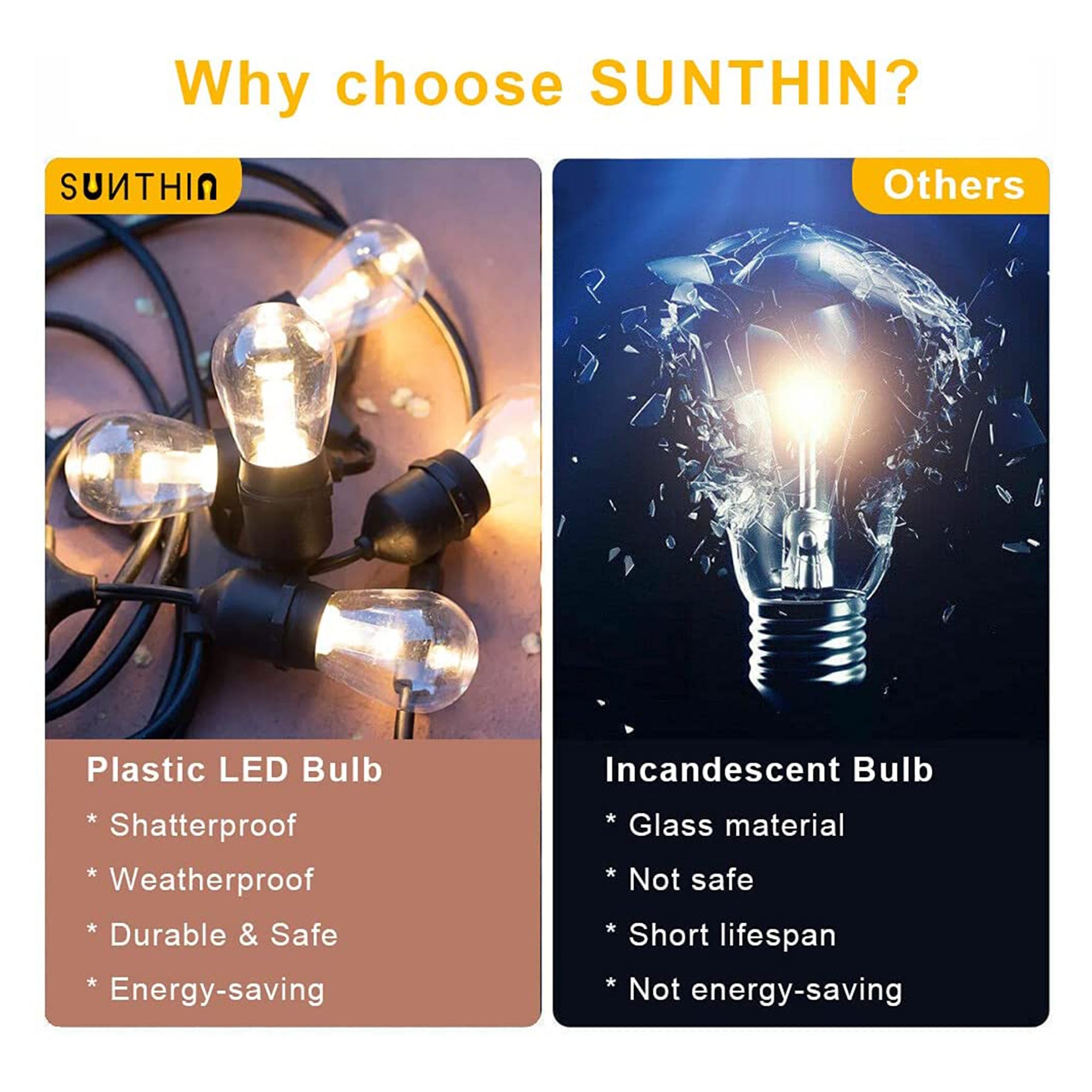 • Plastic bulbs provide a safe and family-friendly environment without the potential shattering or glass shards