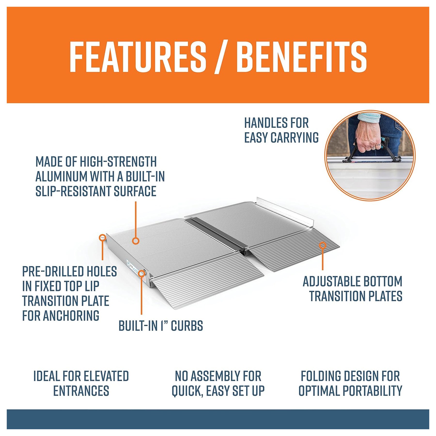 • Elevate your mobility using this easily portable ramp features a single-fold design, offering a speedy and user-friendly inclusion to your mobility aids, perfectly suited for scooter and wheelchair users