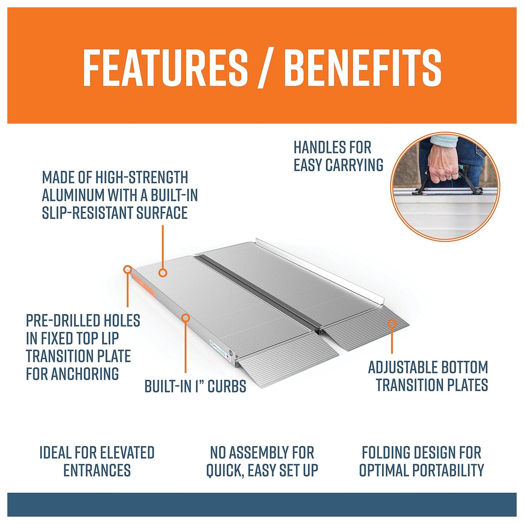 • Elevate your mobility using this easily portable ramp features a single-fold design, offering a speedy and user-friendly inclusion to your mobility aids, perfectly suited for scooter and wheelchair users