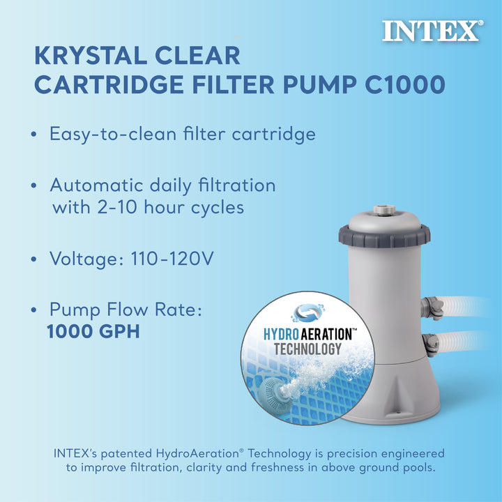 - Includes filtration pump water filter cartridge (Intex Type A or C cartridge)