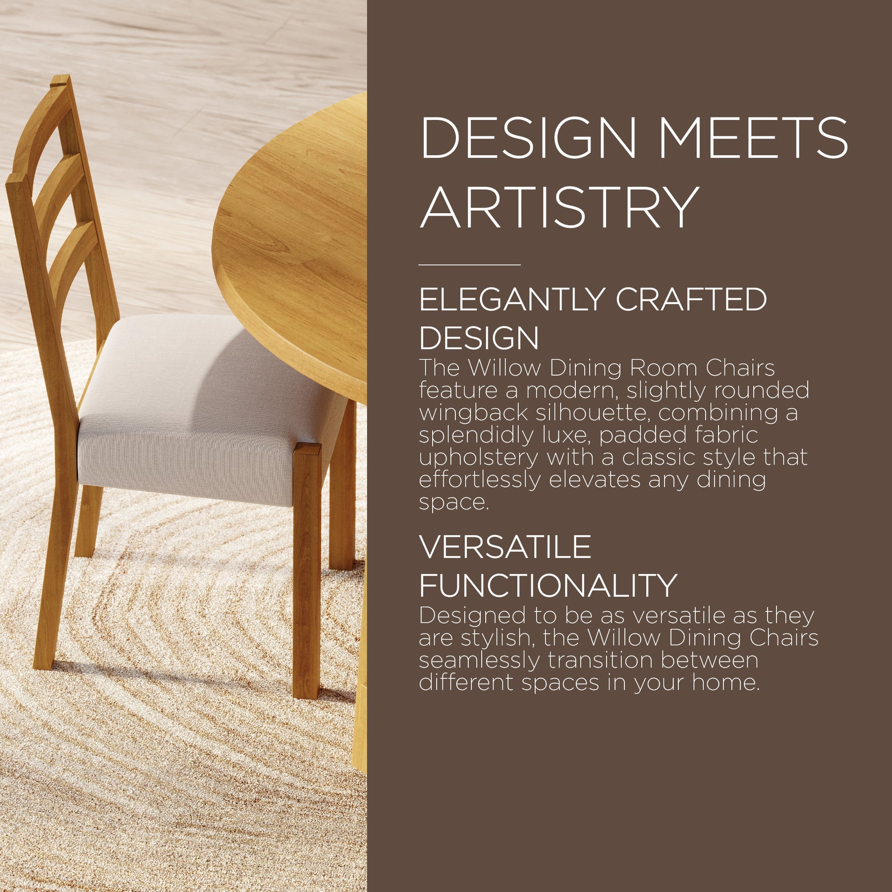 • Solid wood furniture with a neutral finish is our specialty, and the Willow Dining Chair delivers impeccably well