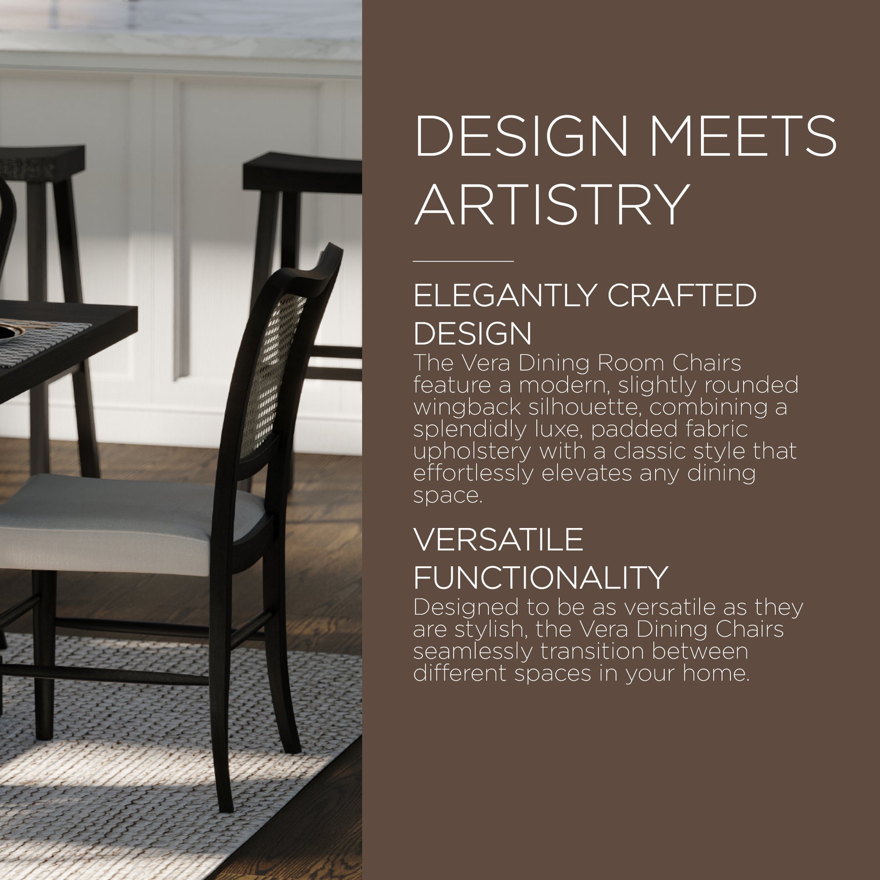 - Vera Dining Room Chairs offer organic vibes and neutral splendor to complete your dining room vision with a beautiful caned back, naturally finished wood frame, plush seating, and polished premium fabric upholstery