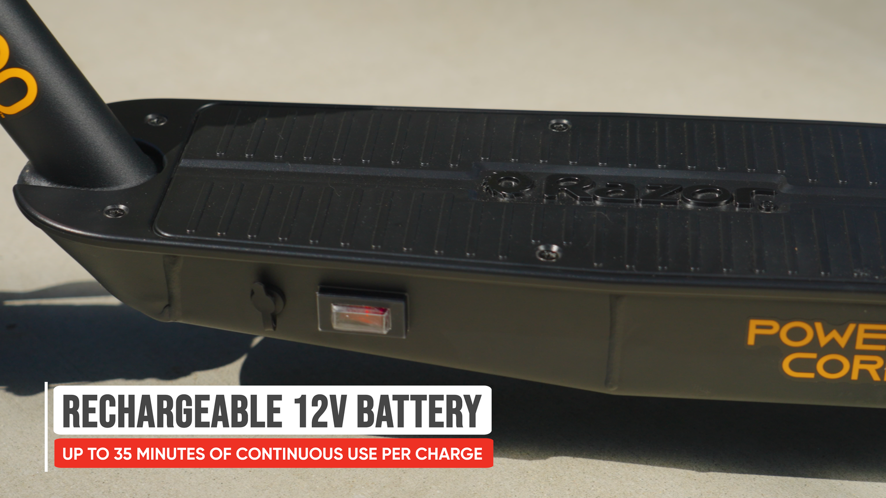 • Powered by a rechargeable 12V lead-acid battery that offers a ride time of up to 35 minutes of continuous use