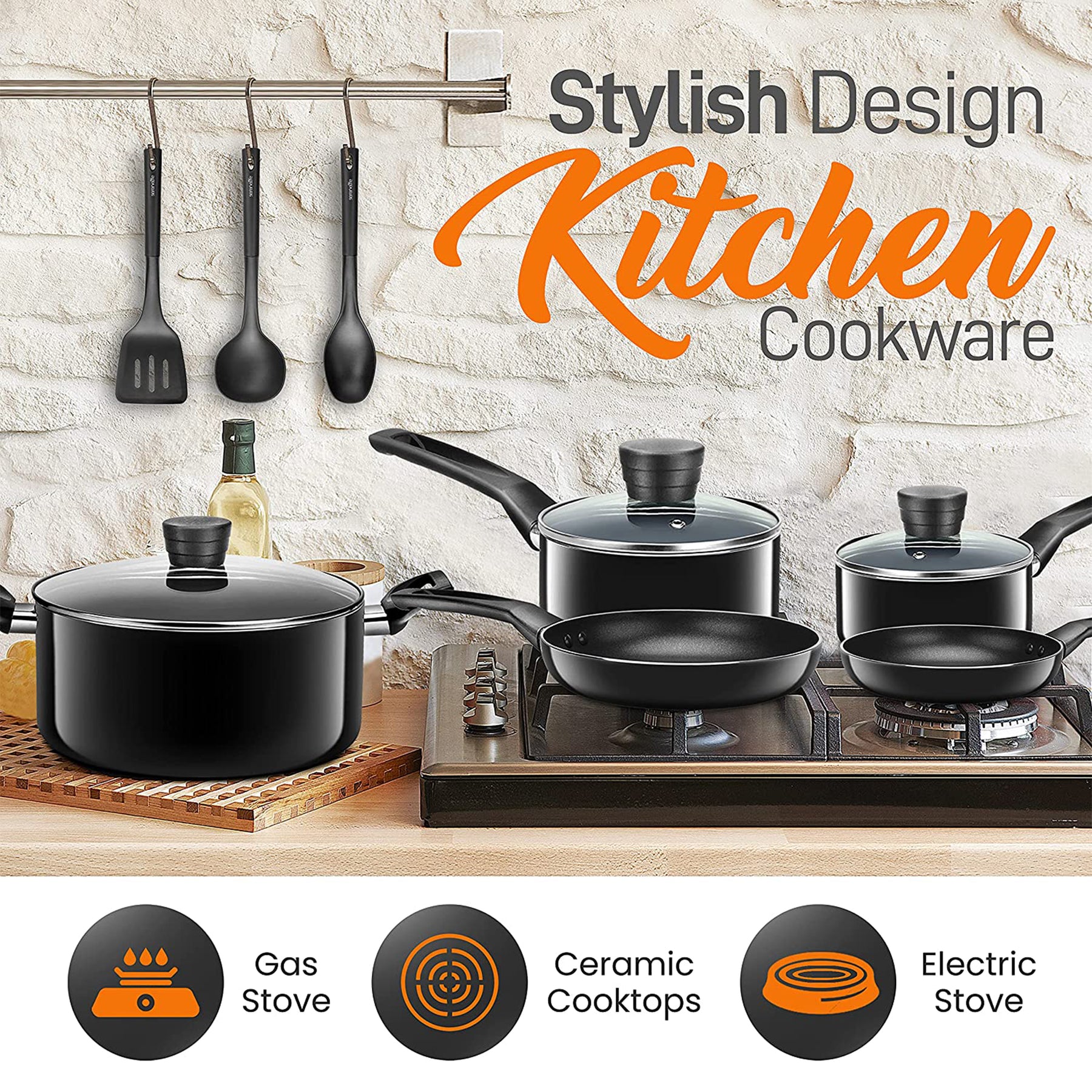 - Set includes various sized pots and pans as well as cooking utensils so you have all the cookware you need