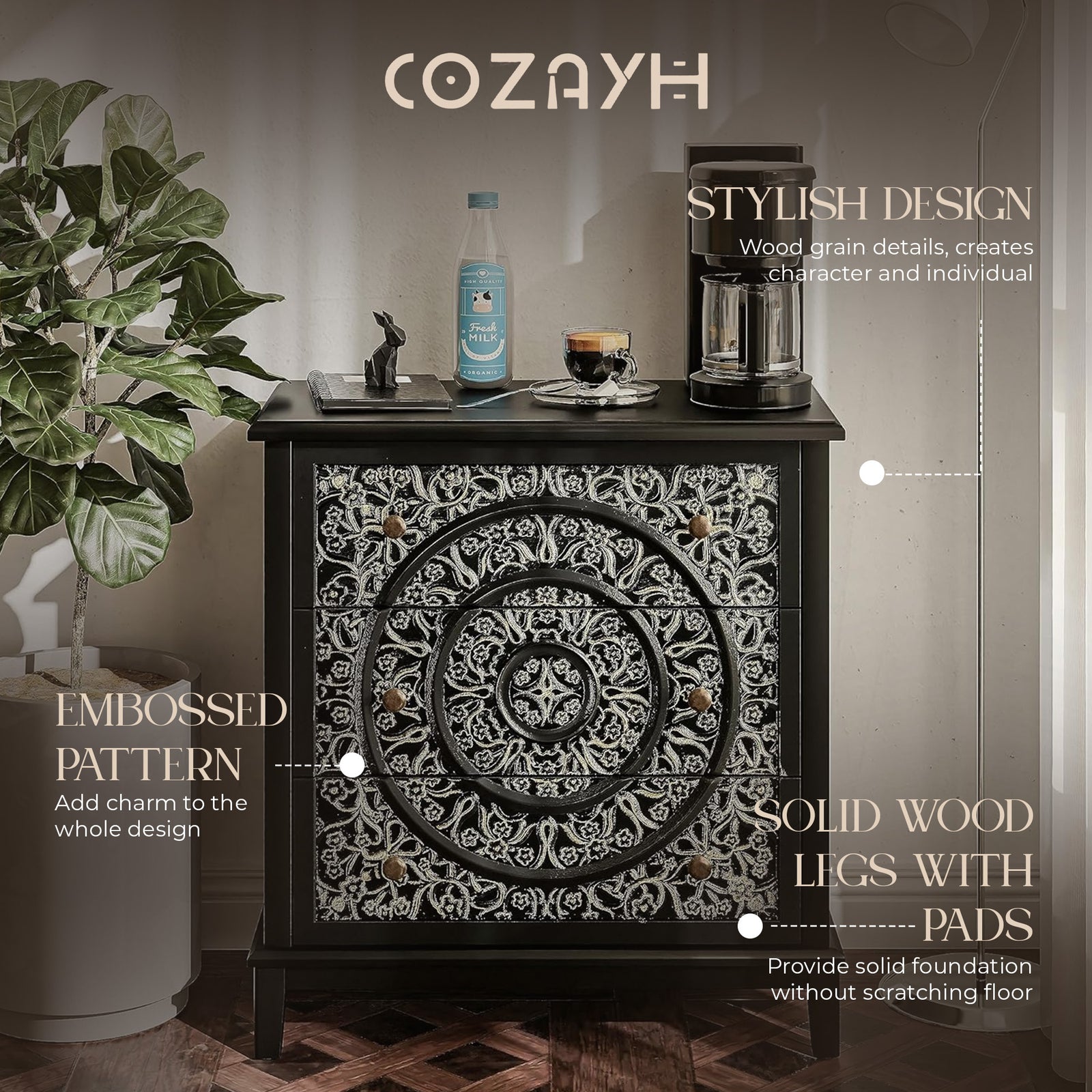 COZAYH 3-Drawer Flower Motif Dresser Fully Assembled Furniture, Gold & Black