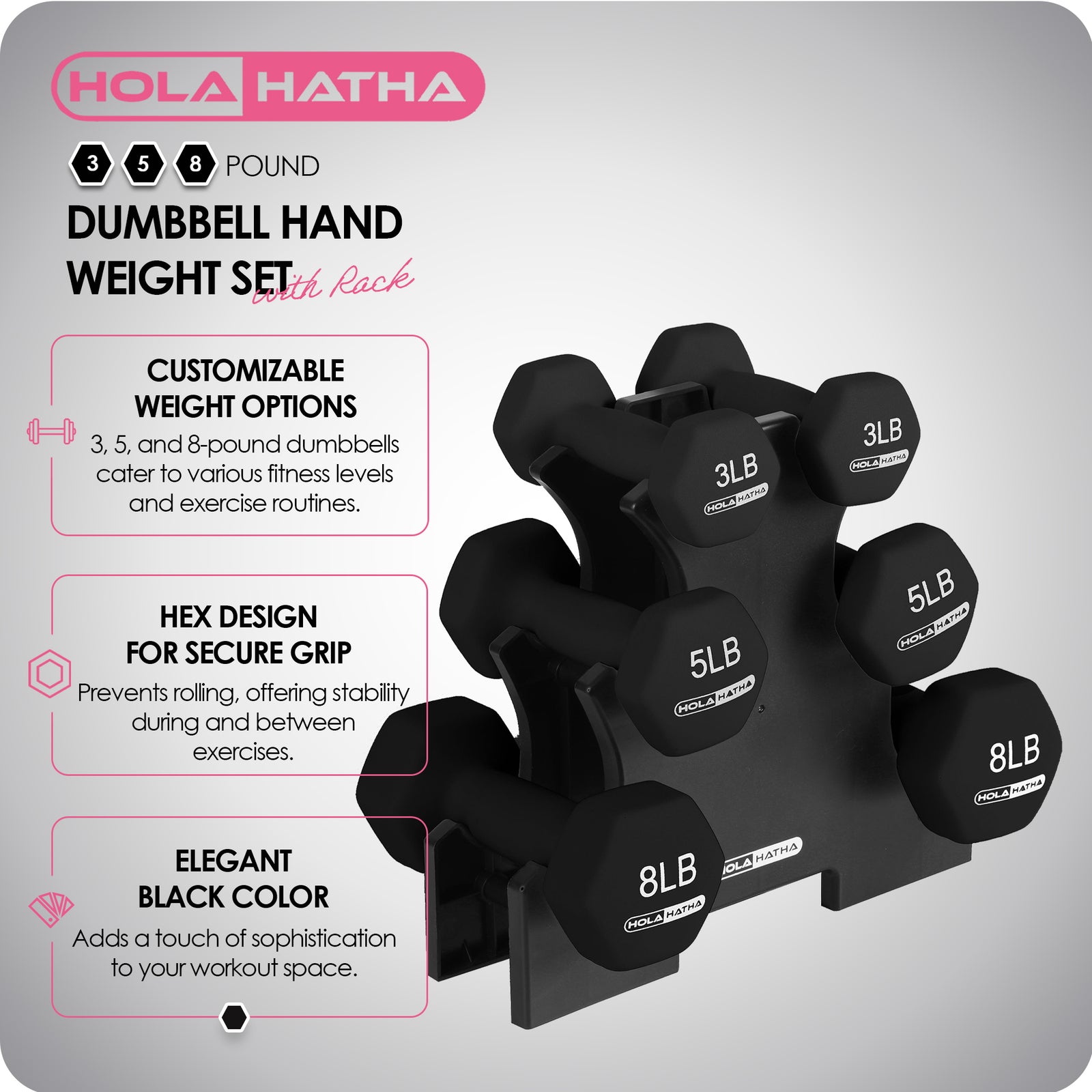 HolaHatha 3, 5, & 8Lb Dumbbell Hand Weight Set w/Storage Rack, Black (Open Box)