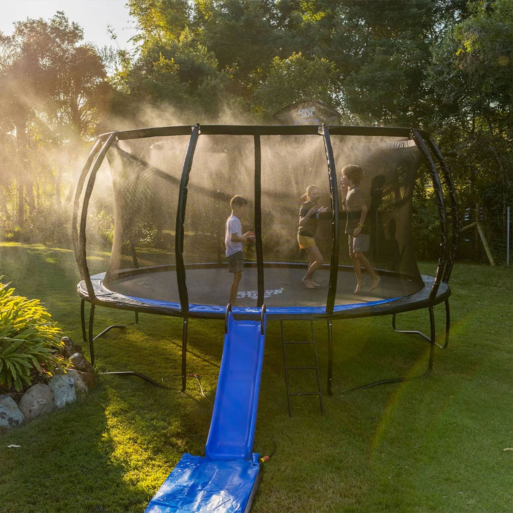 - Bundle includes a basketball hoop, slide, and sprayer to add even more fun to your outdoor trampoline