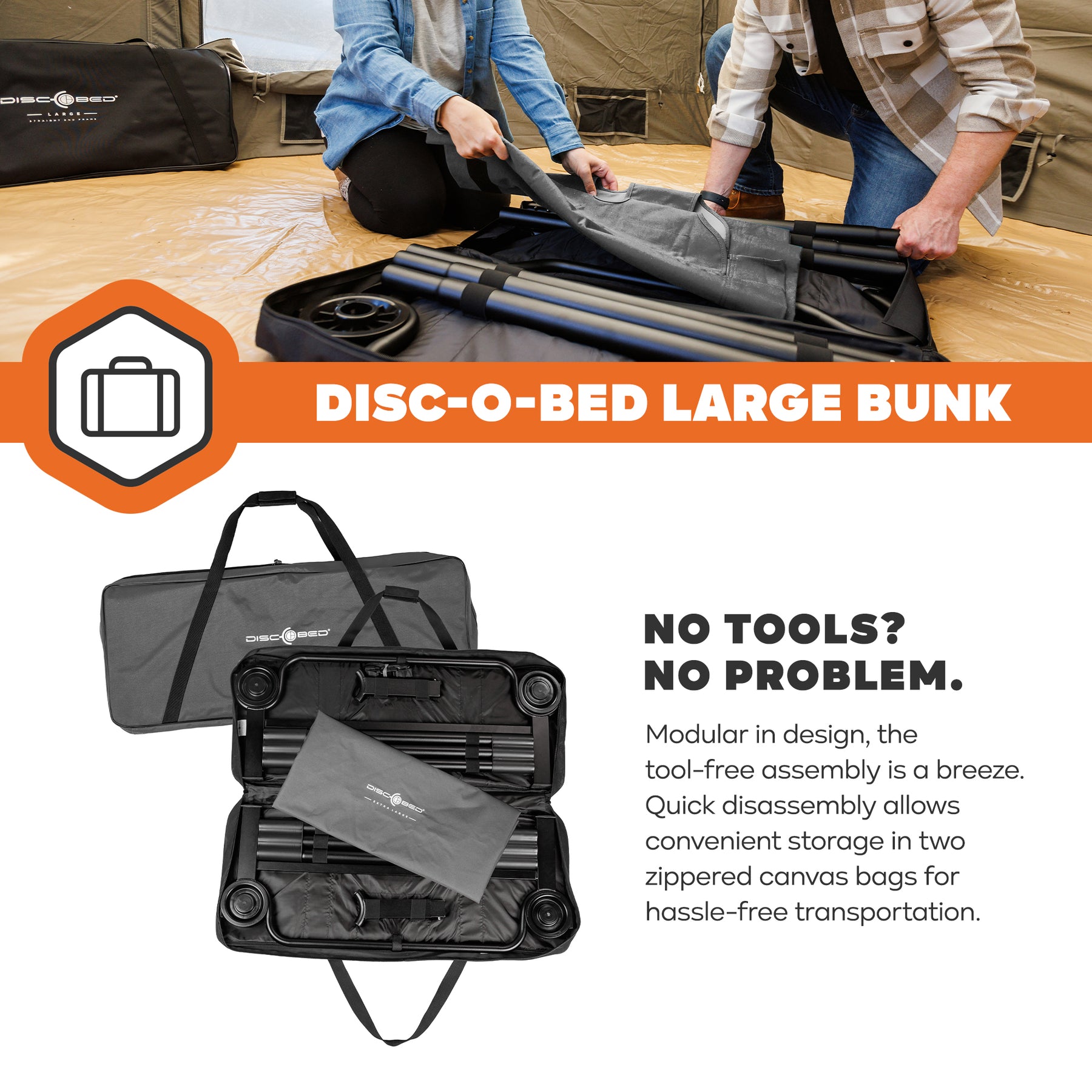 The Disc-O-Bed Large Bunk ensures a comfortable night's sleep, whether you're camping or hosting guests. Its patented disc assembly system makes setup a breeze, and the sturdy steel frame provides stability on any terrain. Say goodbye to uncomfortable middle bars for a restful night of sleep. The Disc-O-Bed Large system fits two people and maximizes floor space with an 11-inch ground clearance and 21-inch distance between cots. Its robust, rust-resistant, powder-coated steel frame can support up to 500 lbs per single cot. The high grade polyester sleeping deck is removable for easy cleaning, and the package includes two cots, two carry bags, stack adapters, and locking straps. Plus, it comes with a 5-Year Limited Manufacturer's Warranty. Upgrade your camping comfort today!