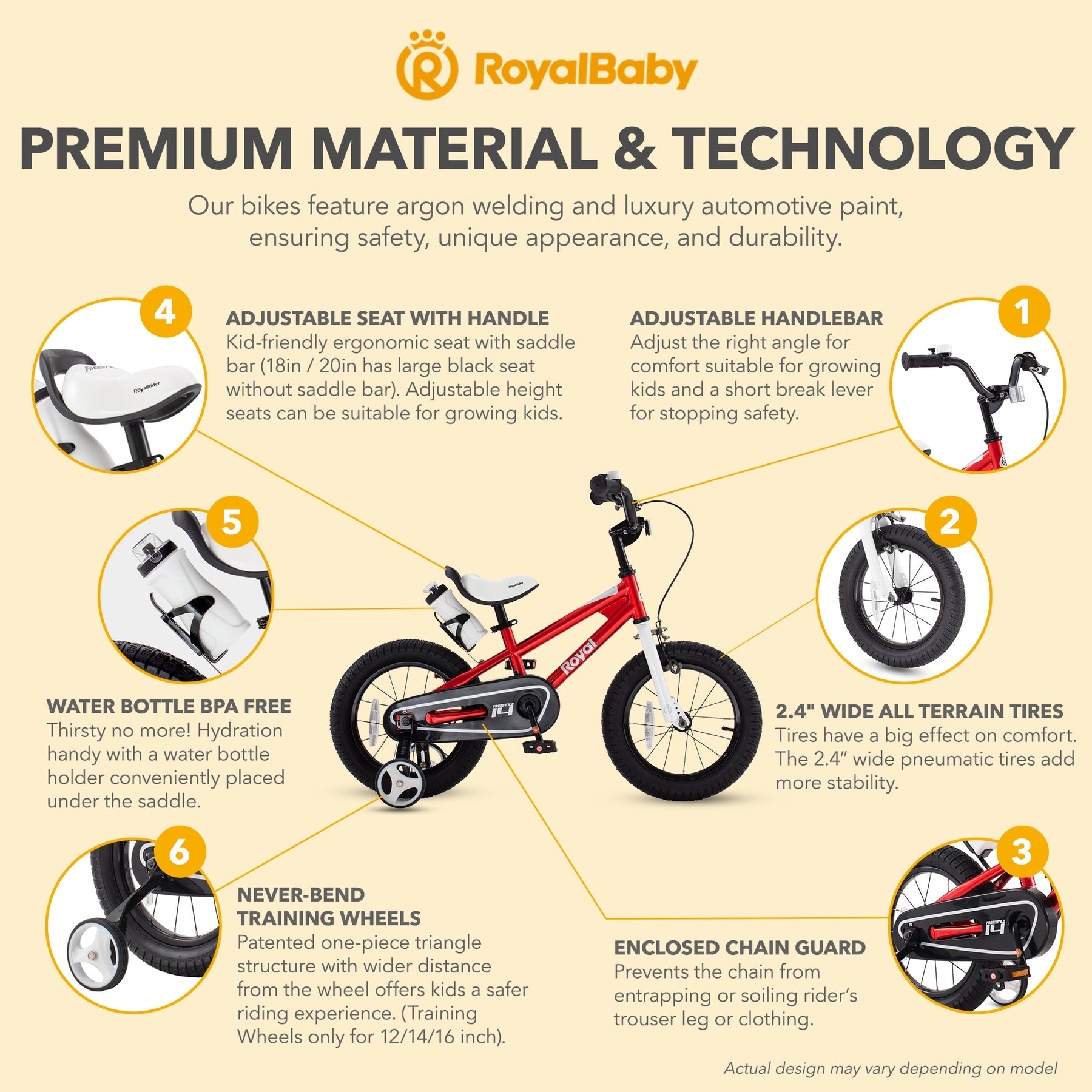 - Equipped with RoyalBaby patented sealed bearing for smooth pedaling while the never-bent training wheels and seat holder help maintain balance while learning to ride
