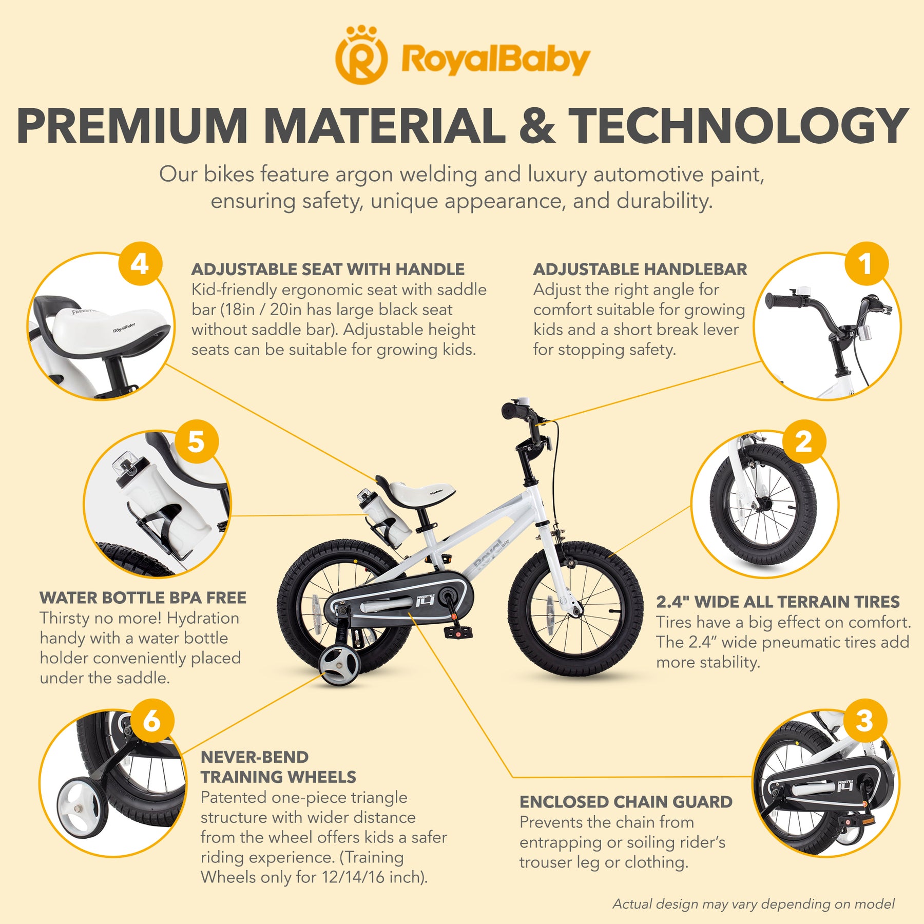- Equipped with RoyalBaby patented sealed bearing for smooth pedaling while the never-bent training wheels and seat holder help maintain balance while learning to ride