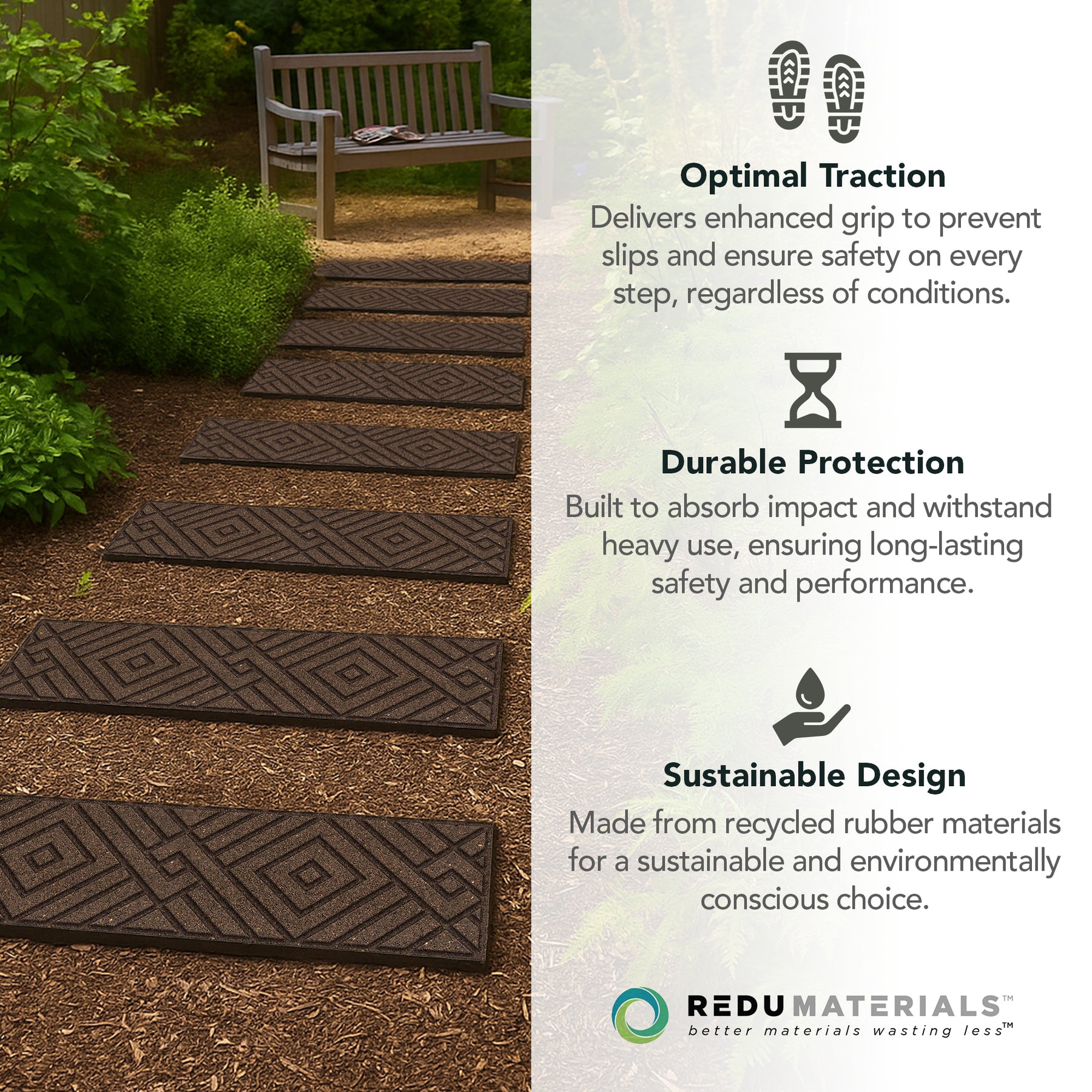 Recycled rubber stepping treads are easy to install, require no maintenance, and look natural. They're perfect for creating enchanting stairs, walkways, or paths in gardens and backyards. The rubber surface is impact absorbing and protects shoes from dirt, even in wet and muddy areas, and the raised textured design provides traction for stability. They are protected in all weather, durable, lightweight, and easy to clean, which means there is no need to swap out these stepping mats during the winter months.