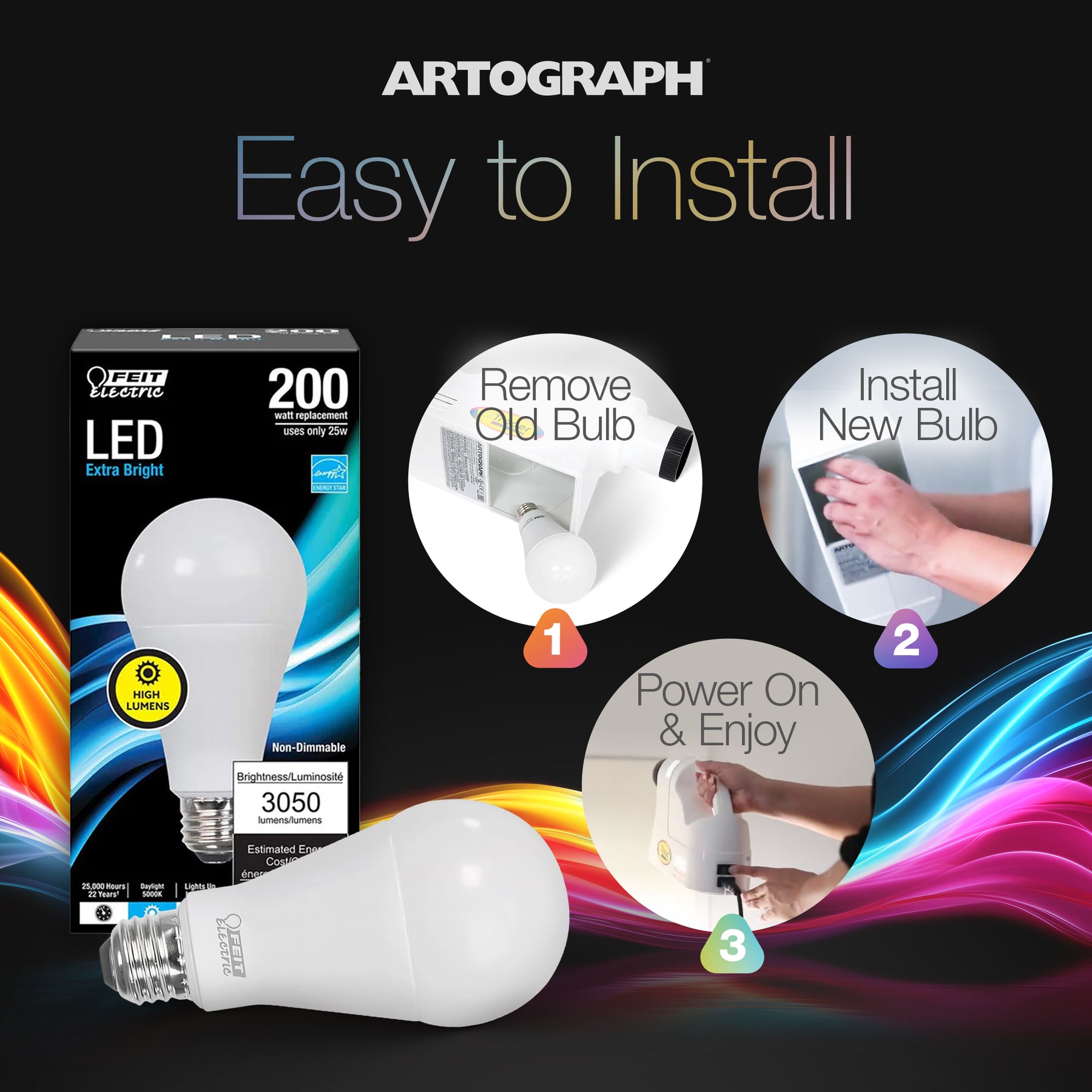 With a powerful 3050 lumens of illumination, these 25-watt LED bulbs deliver the same brightness as a traditional 200-watt incandescent bulb while using a fraction of the energy. The 5000K daylight color temperature ensures crisp, vibrant projections, bringing clarity and accuracy to your work. Designed with an E26 standard base, they fit effortlessly into your projector, allowing for quick and easy installation. Plus, instant-on technology ensures full brightness the moment you switch it on.