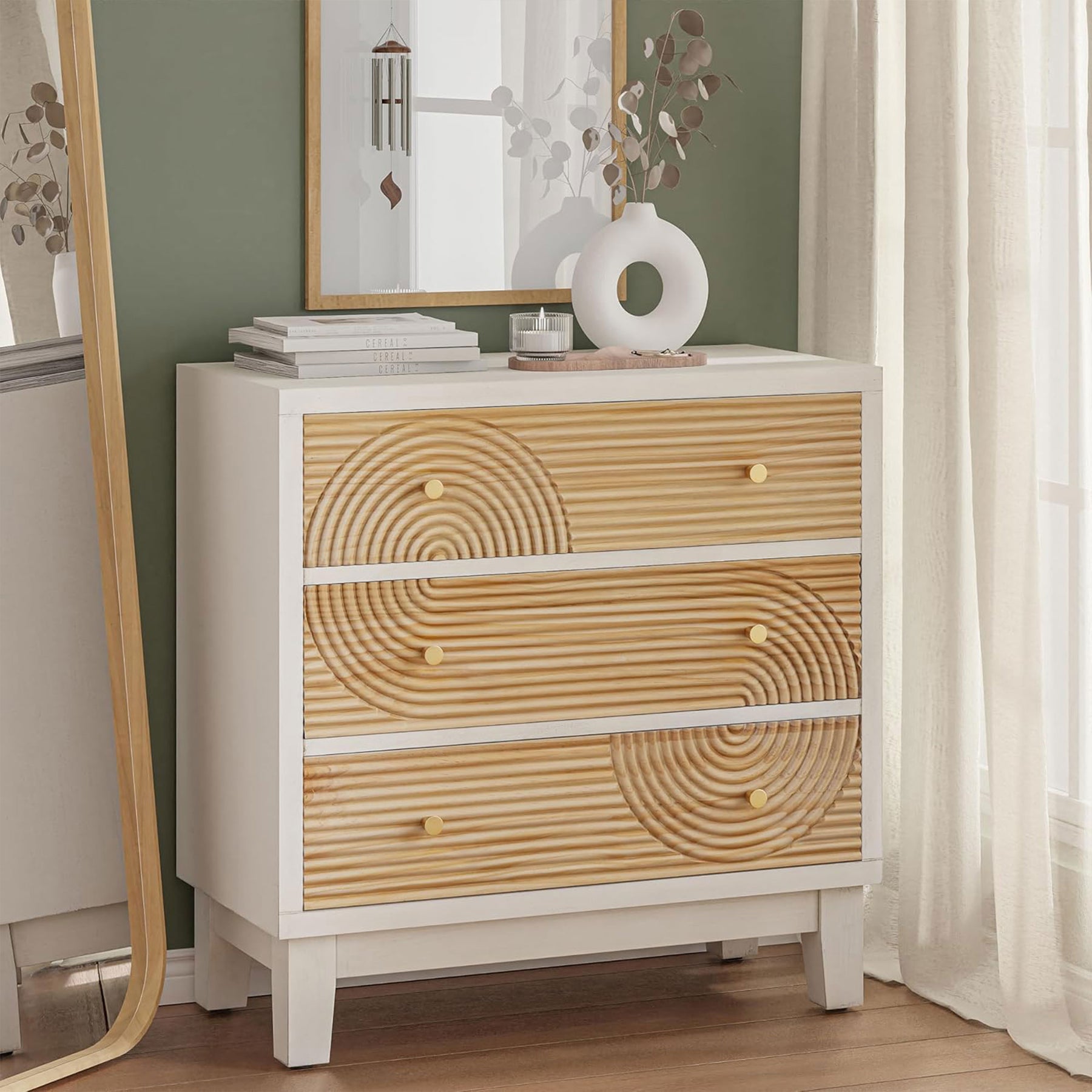 Bring natural beauty and artisan detail into your home with the COZAYH 3-Drawer Farmhouse Dresser, a handcrafted piece that blends rustic style with mid-century charm. Designed with a handicraft wood ring motif on the drawer fronts and a white finish, this dresser adds warmth and character to any bedroom, entryway, or living space.