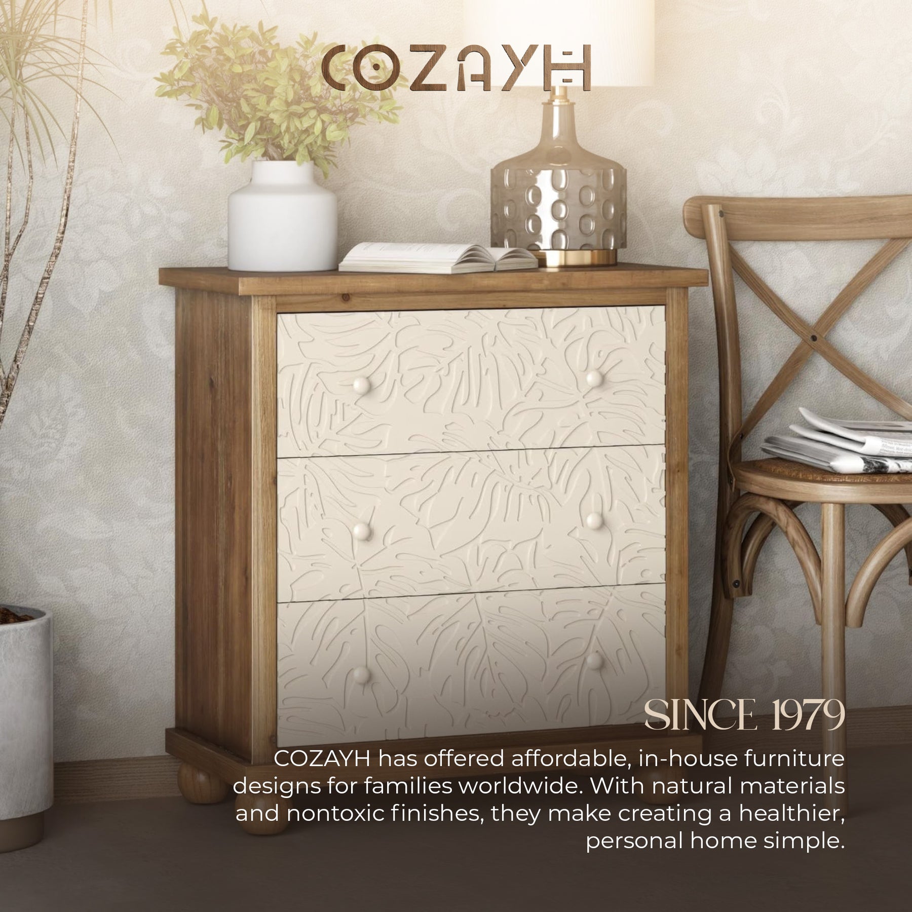 Bring warmth, character, and functionality to your space with the COZAYH Rustic Farmhouse Dresser, a beautifully designed storage solution that blends timeless charm with modern convenience. This 3-drawer dresser features exquisitely carved lifelike leaf patterns that evoke a natural elegance, making it a stunning focal point in any bedroom or living room. The creamy white finish, accented with vintage brown wood grain details, creates a cozy, rustic farmhouse aesthetic that complements a variety of home décor styles.