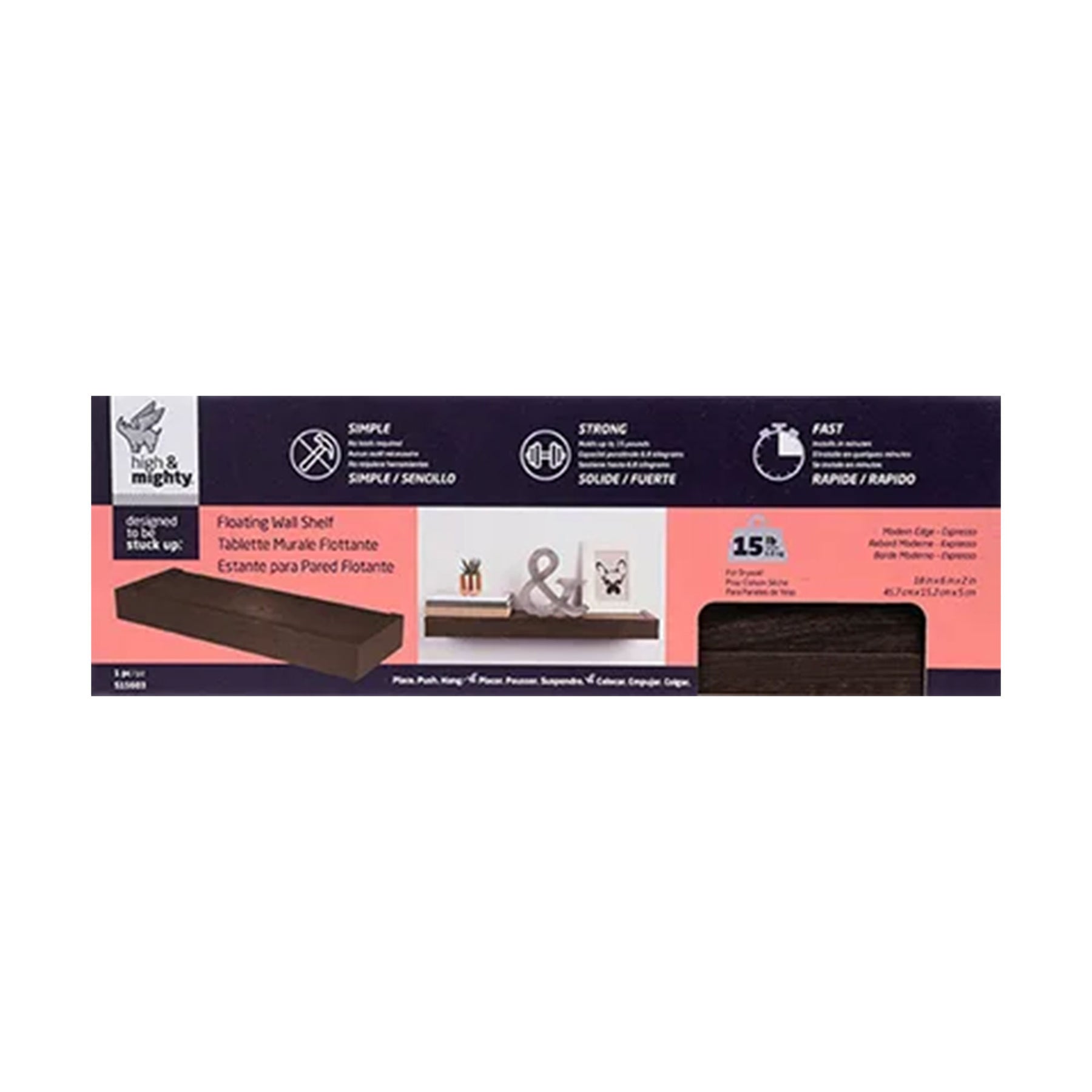 Upgrade your space with a High & Mighty 18-inch Modern Floating Shelf that offers practical storage solutions for your home or office.