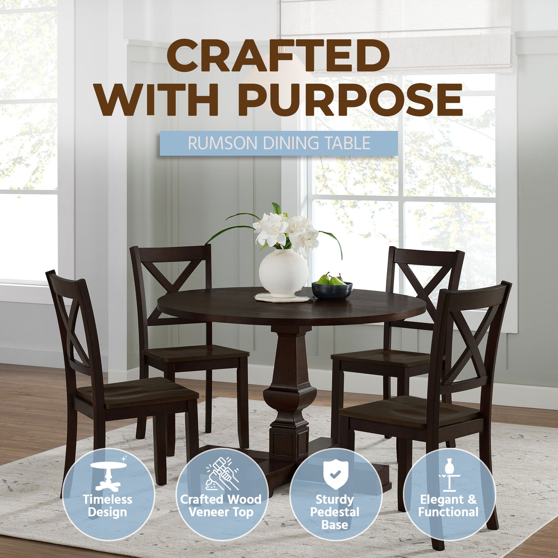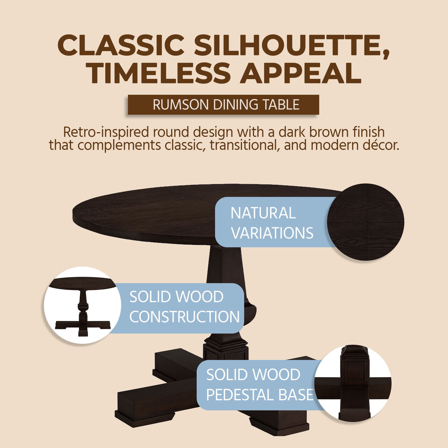 • Round 44-inch dining table features a rich dark wood finish and a smooth veneer top, bringing a warm, refined look to your home