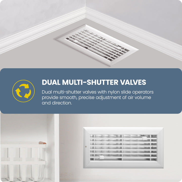 Unlike standard vent covers, this register is engineered with dual multi-shutter valves and nylon slide operators, allowing for effortless adjustment of air volume and direction. The integrated damper makes it easy to achieve balanced airflow for heating and cooling, giving you greater control over comfort in every room. Precision sizing ensures a secure fit in standard duct openings, while the low-profile design maintains a clean, unobtrusive look.