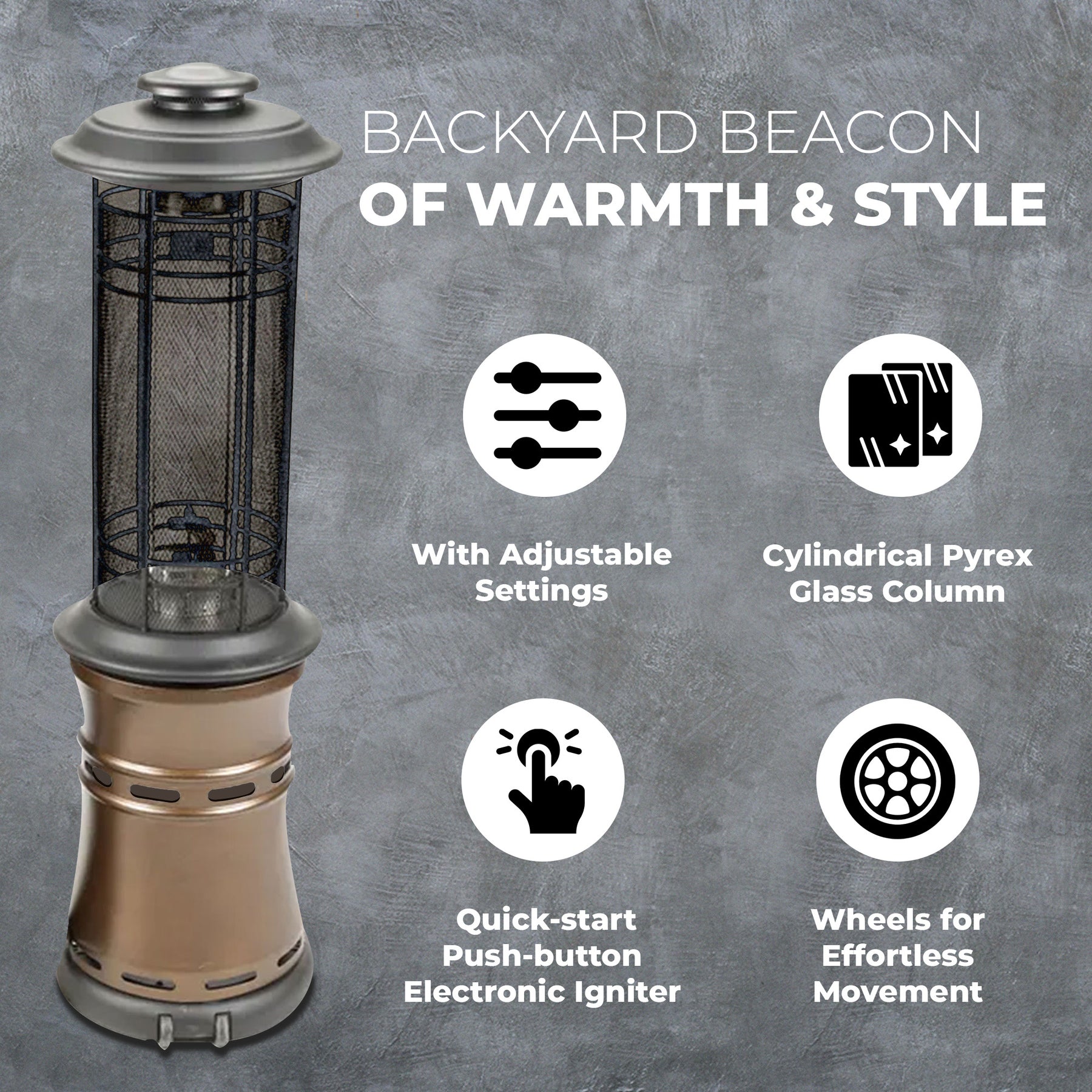 • Designed with wheels for effortless movement, this patio heater can be positioned wherever you need warmth, providing both flexibility and comfort for any outdoor setting
