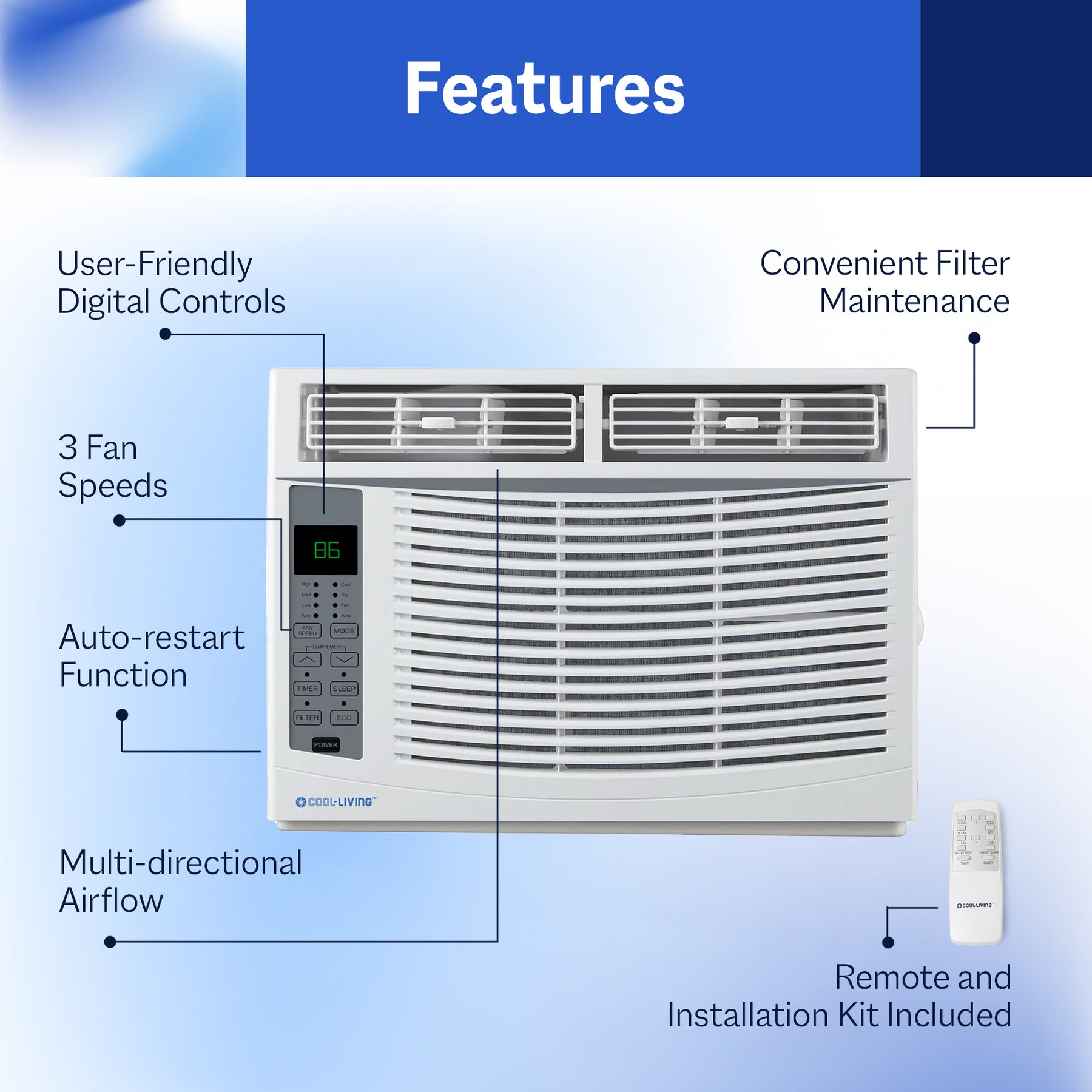 This window-mounted air conditioner is easy to install with the included fitting kit, making setup a breeze. This air conditioner is designed to be installed in a standard double-hung window with a window width between 23" and 36" (584mm-914 mm). The Lower Sash (the lower part of the window that moves up and down) must allow for 14.5" of vertical clearance when open. The digital display and remote control allow you to adjust cooling settings effortlessly, offering three cool modes and three fan speeds to tailor the airflow to your preference. You can also direct the airflow precisely where it's needed with the multi-directional vent, ensuring optimal comfort throughout the room.