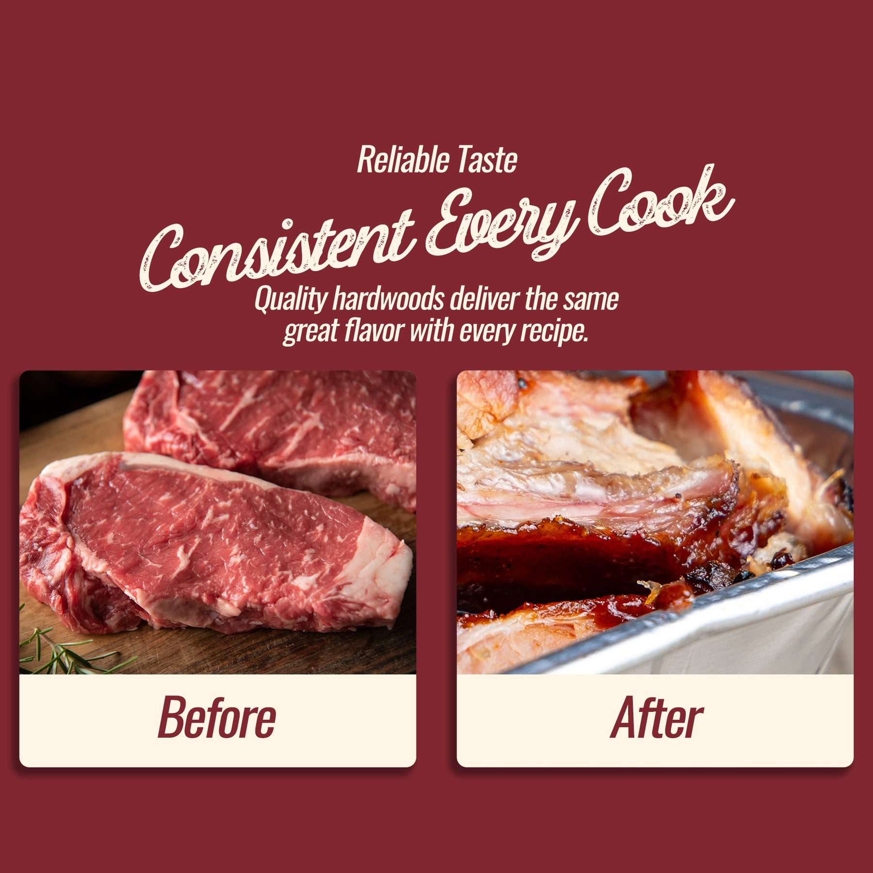 Our wood chips are 100% all-natural, free from additives and chemicals, ensuring the purest flavor possible. We’ve gone the extra step by removing all bitter bark and thoroughly drying every chunk for low moisture content, resulting in consistent smoke and a clean, even burn every time. Each chunk is finer and precision ground for an ideal consistent burn, making them ideal for Gas, Charcoal, and Kamado grills.