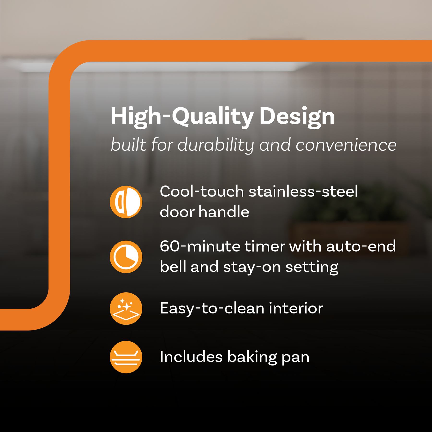 This toaster oven combo has a convenient 60-minute timer and a stay-on setting, so you can control your cooking time for ideal results. The cool-touch stainless-steel door handle ensures safety during operation, and the included baking pan adds convenience to your cooking process. With its sleek design and user-friendly features, the Complete Cuisine electric toaster oven is a must-have for any kitchen.