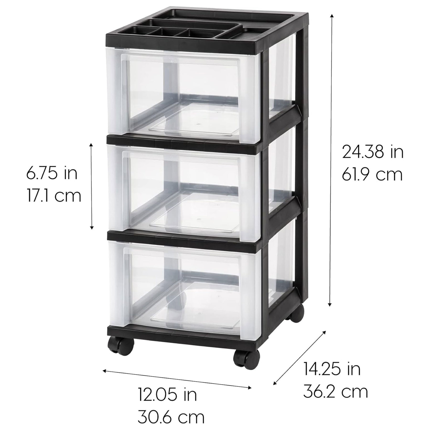 IRIS USA 3-Drawer Plastic Storage Organizer Cart with Caster Wheels, Black/Clear