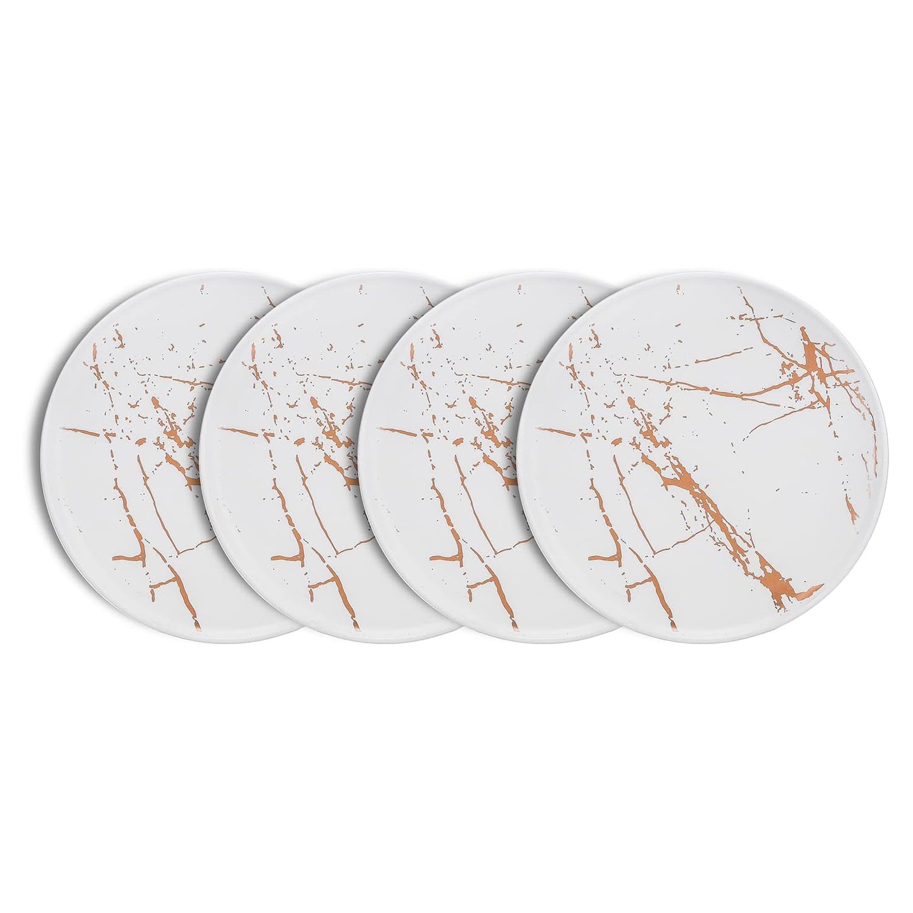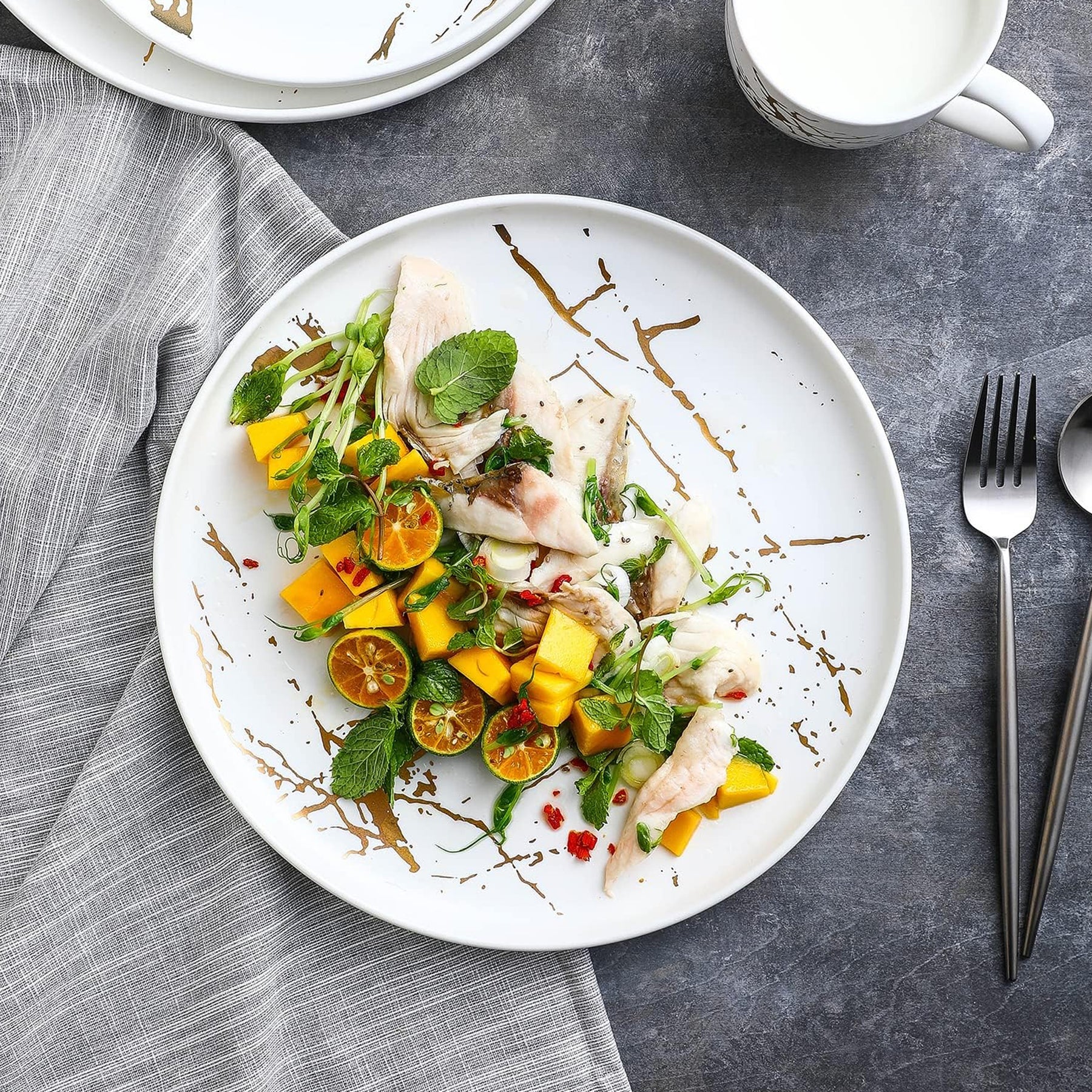• Zora plate set features a gold splatter accent on a crisp white surface for a trendy, modern touch