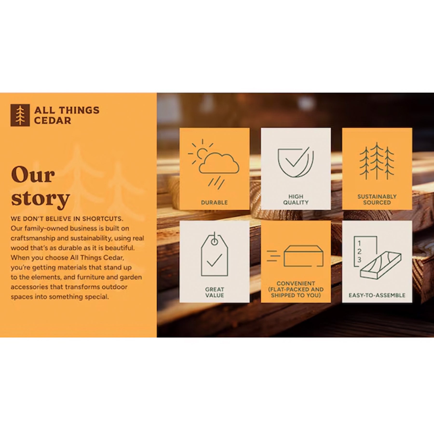 - Handmade with Care: For 25 years, All Things Cedar has crafted beautiful patio furniture and garden accessories from sustainably-sourced wood. With easy-to-assemble, built-to-last designs, our customers can be proud of their outdoor space and love these handmade pieces for years to come