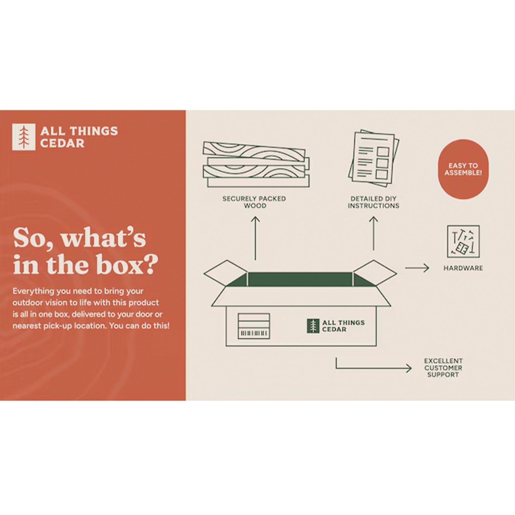 - Enjoy a seamless 1-1.5 hour assembly and years of durable, weather-resistant cedar elegance with our snug-fitting, sanded design