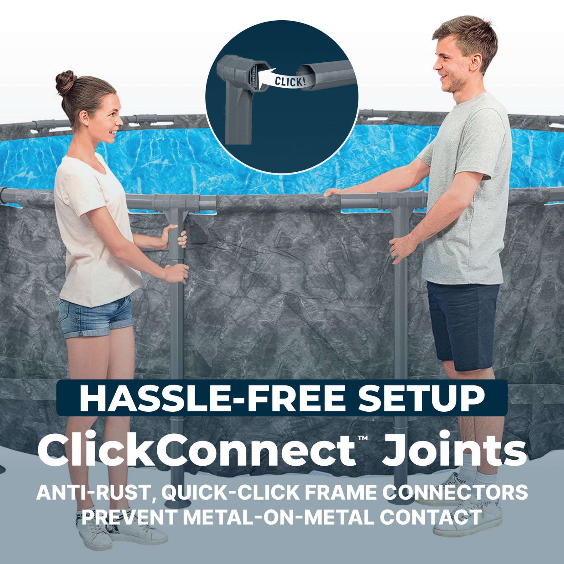 Built to last, this pool features a galvanized steel frame that resists corrosion. The 100% steel frame is coated in a layer of zinc, providing resistance to rust and protection from the elements. Setting up is simple with the ClickConnect joints, requiring no additional tools. The Tritech liner, made of a 3-layer ultra-durable material, is 15% more resistant to tears, 33% more resistant to stretching, and 83% more resistant to punctures than standard PVC, offering superior durability for summers to come.