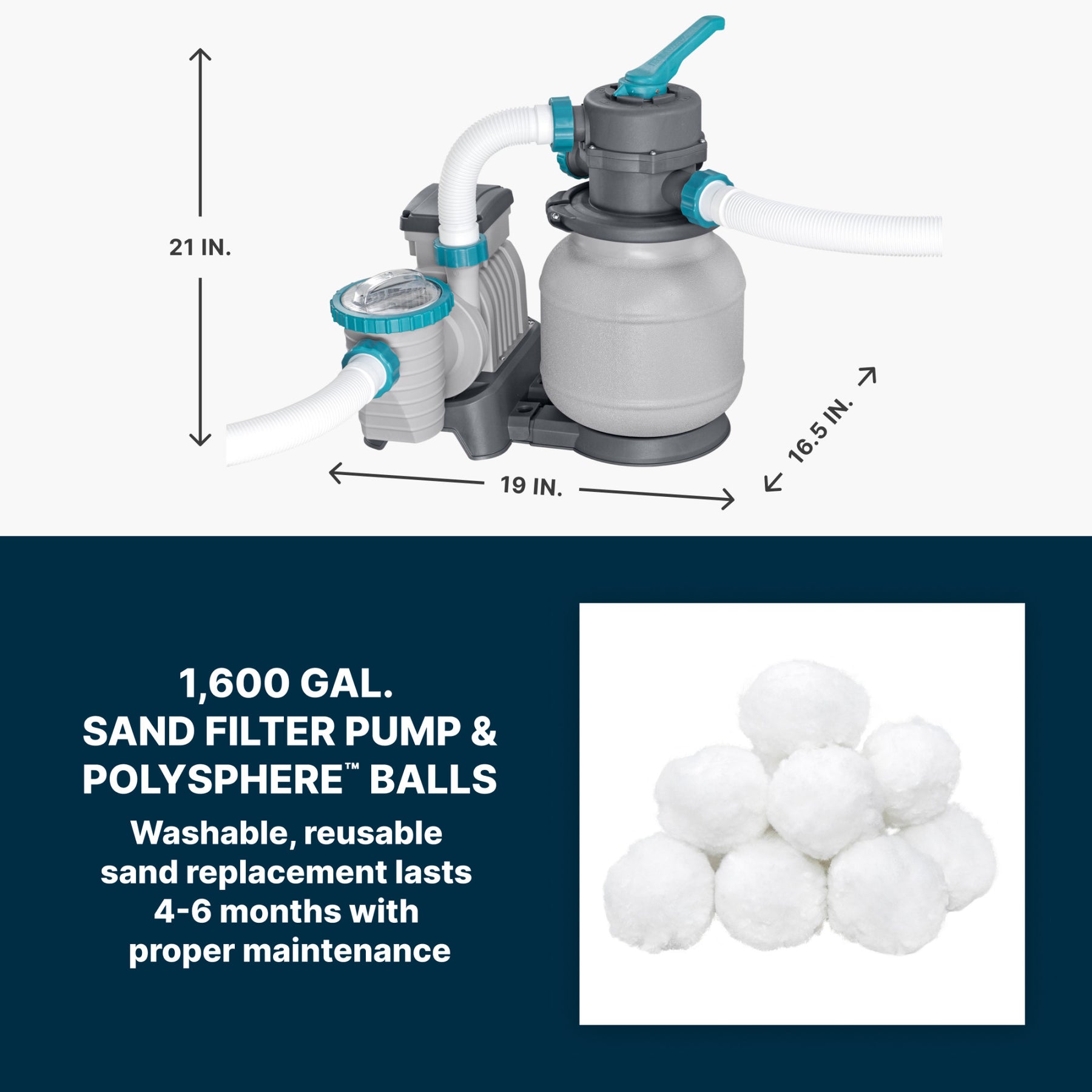 - Complete set includes a 1,600 GPH sand filter pump, 250 grams of Polysphere pool filtration balls (washable, reusable sand filtration replacement), a ladder, pool cover, and a repair patch