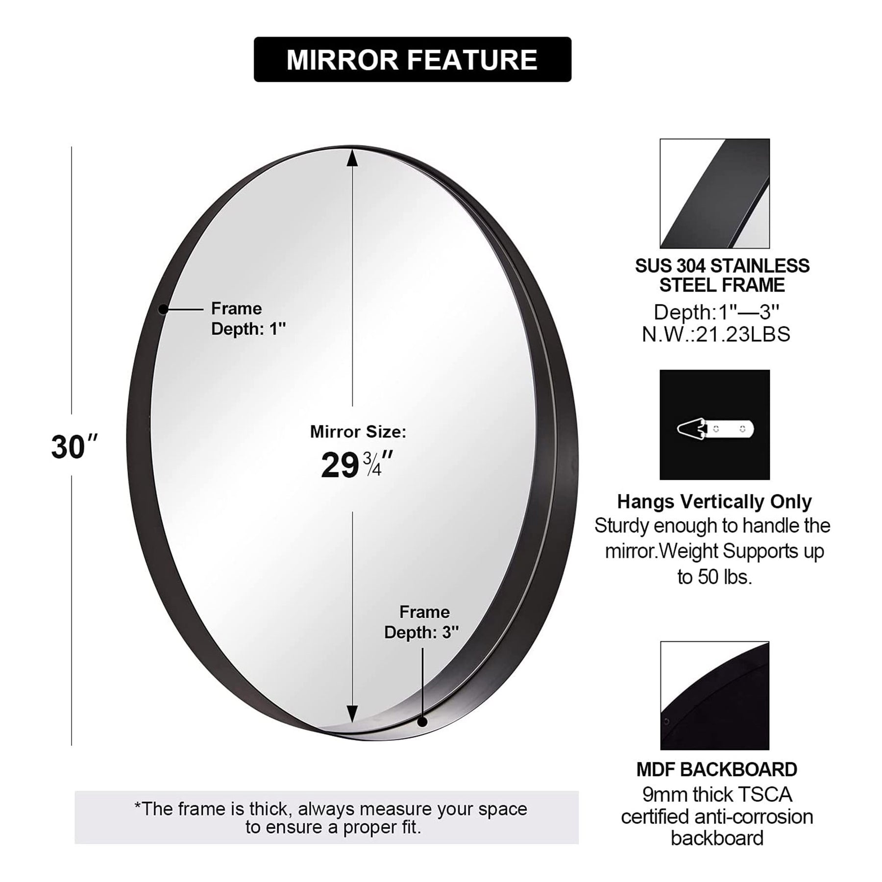 30 Inch Circle Mirror 3 In Deep w/ Stainless Steel Metal Frame, Black (Open Box)