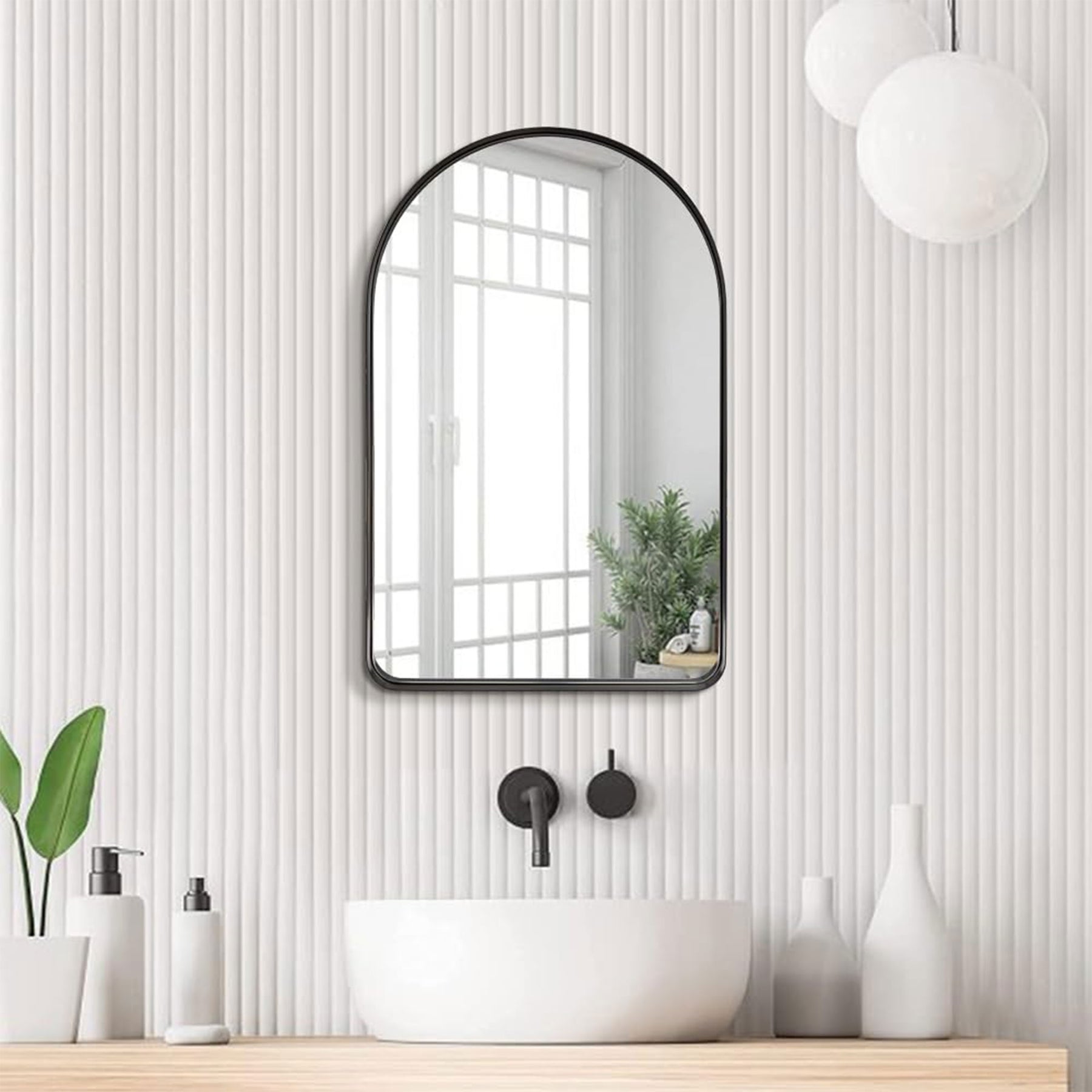 • Elegant wall-mounted mirror with arched steel frame is a versatile addition to your bathroom, entryway, living room, or bedroom