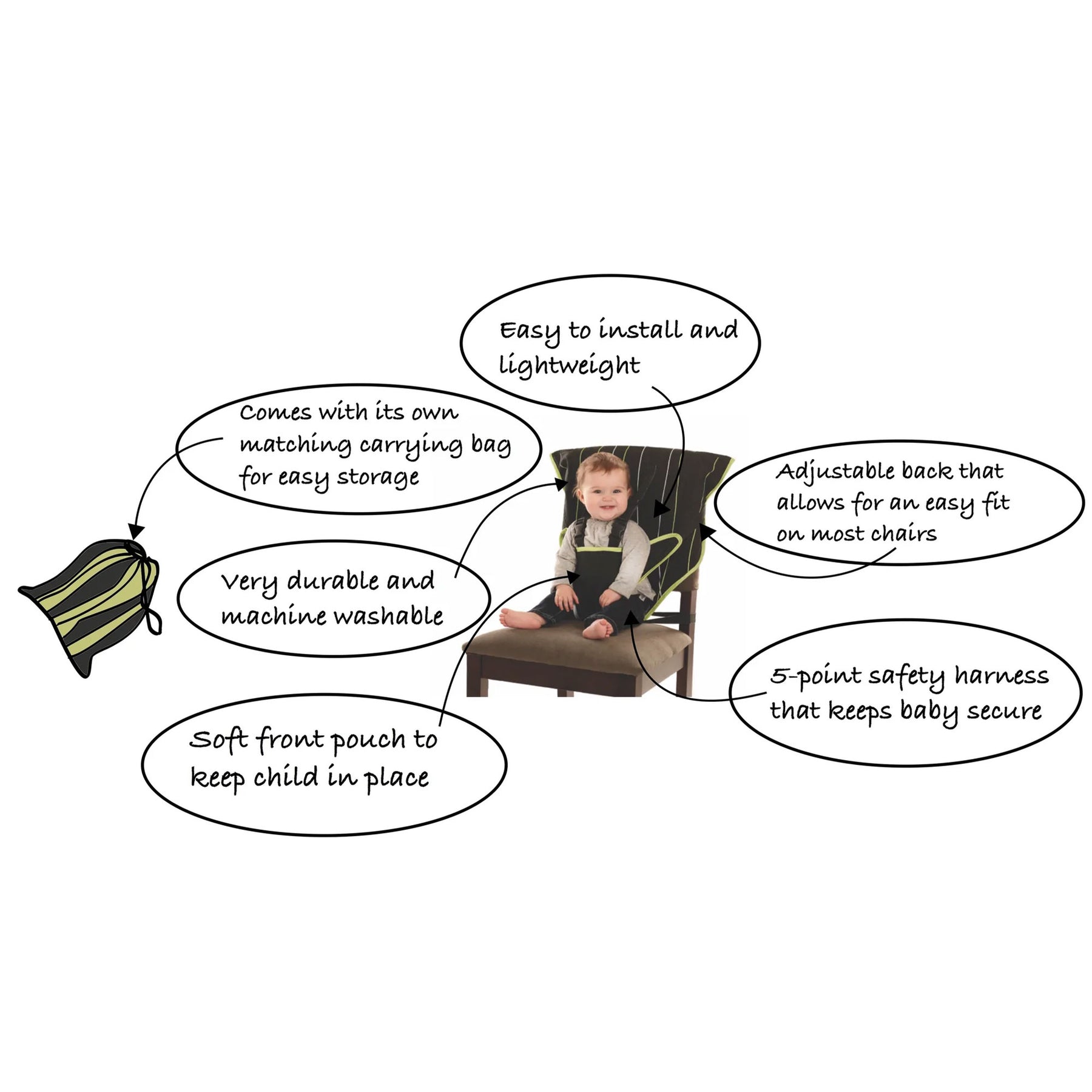 • Portable and lightweight high chair solution for traveling, eating out, and visiting grandparents