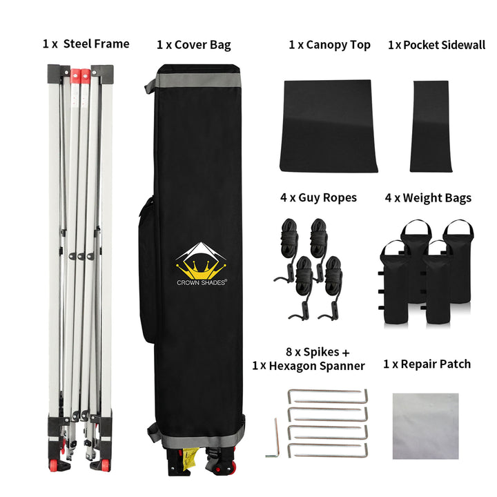 - Package includes frame, canopy top, pocket sidewall, wheeled cover bag, repair patch, 4 guy ropes, 4 empty sandbags, 8 spikes, and 1 hexagon spanner
