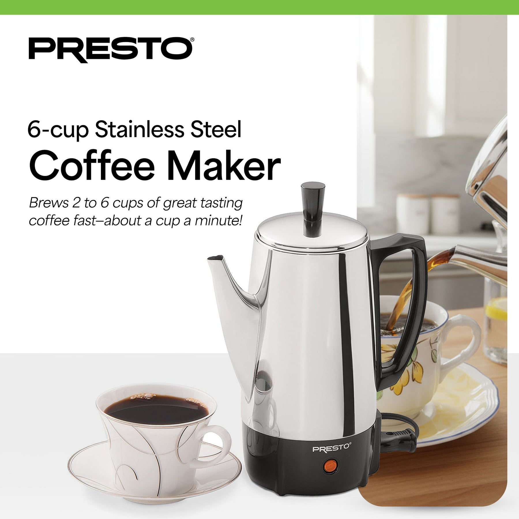 • Classic stainless steel coffee percolator for rich, aromatic coffee