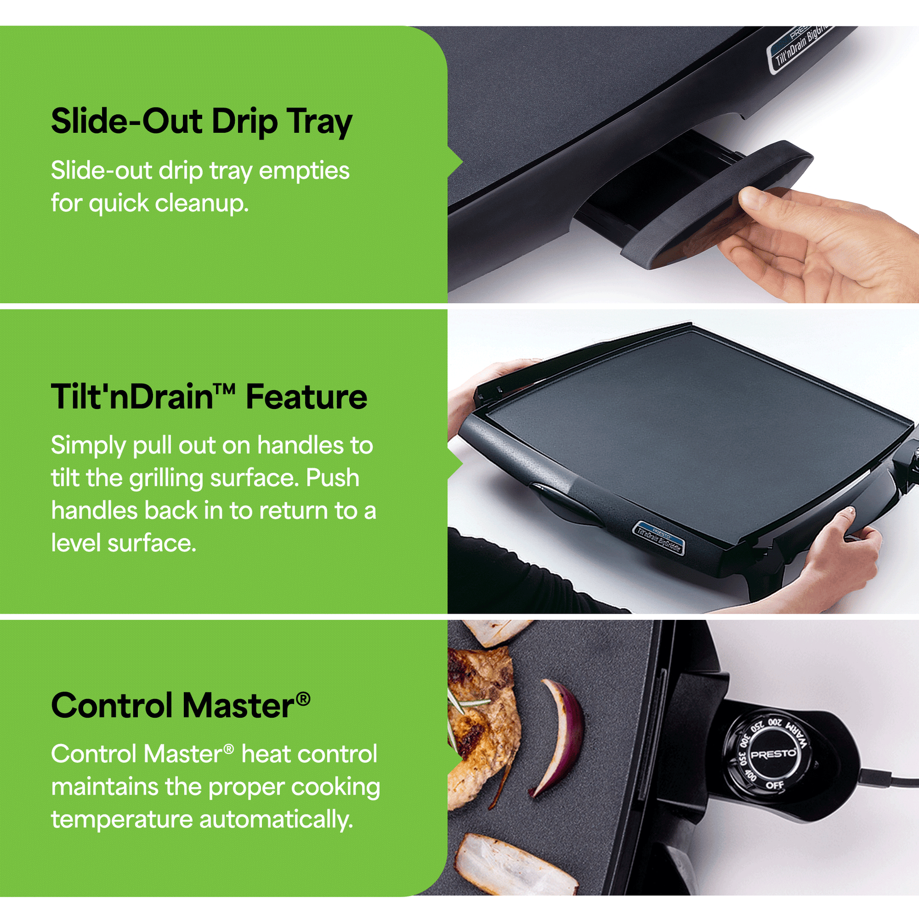 • Prepare meals for the entire family on this extra-large Tilt 'n Drain 22-inch electric griddle with ample cooking space and master heat control to maintain a desired temperature