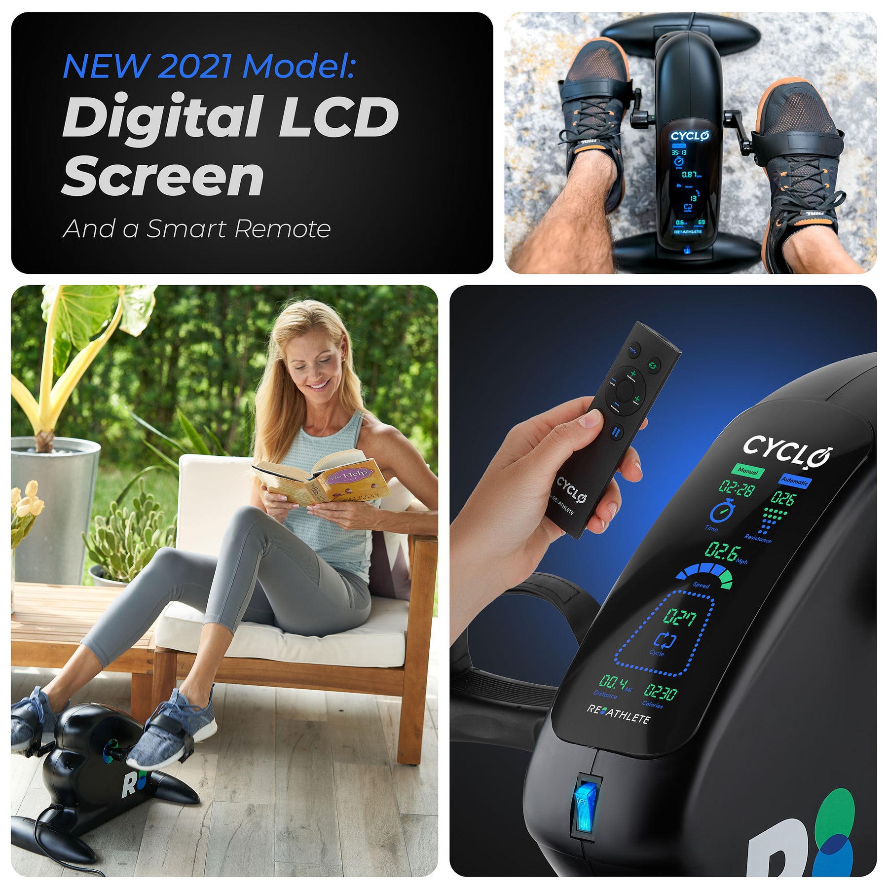 - MEET THE ALL-DIGITAL MARKET LEADER! CYCLO is the most technologically advanced solution among modern compact exercise bikes, and here’s how it’s unique: 12 speeds (good for different rehab plans), a smart remote control for all the functions (no more leaning down to switch the mode), forward and reverse pedaling (for different muscle groups), auto mode (the bike does the pedaling) and manual mode (you do the pedaling). A wide range of desk workout sessions with just one mini exercise bike!
