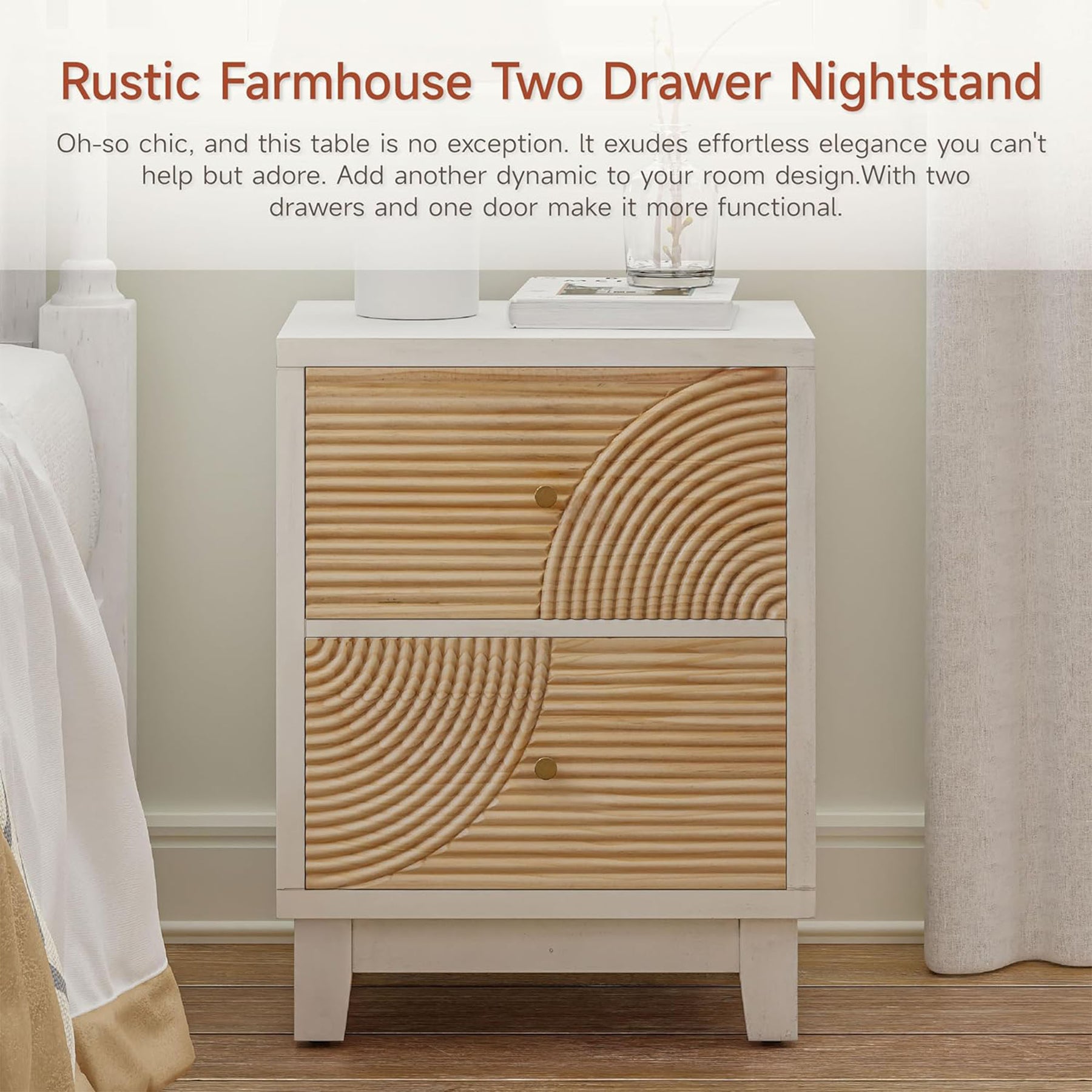 COZAYH 2-Drawer Farmhouse Bedroom Nightstand w/ Rustic Wood Ring Pattern, White