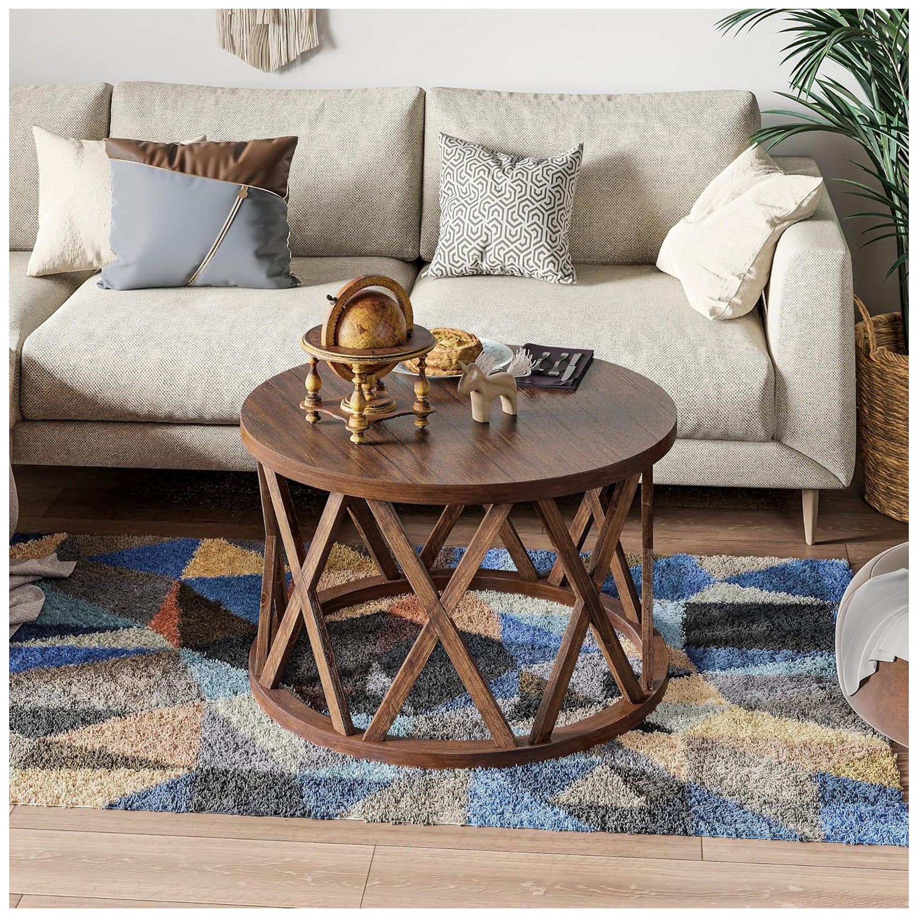 COZAYH Rustic Round Coffee Table with X-Motif Base for Living Room, Brown
