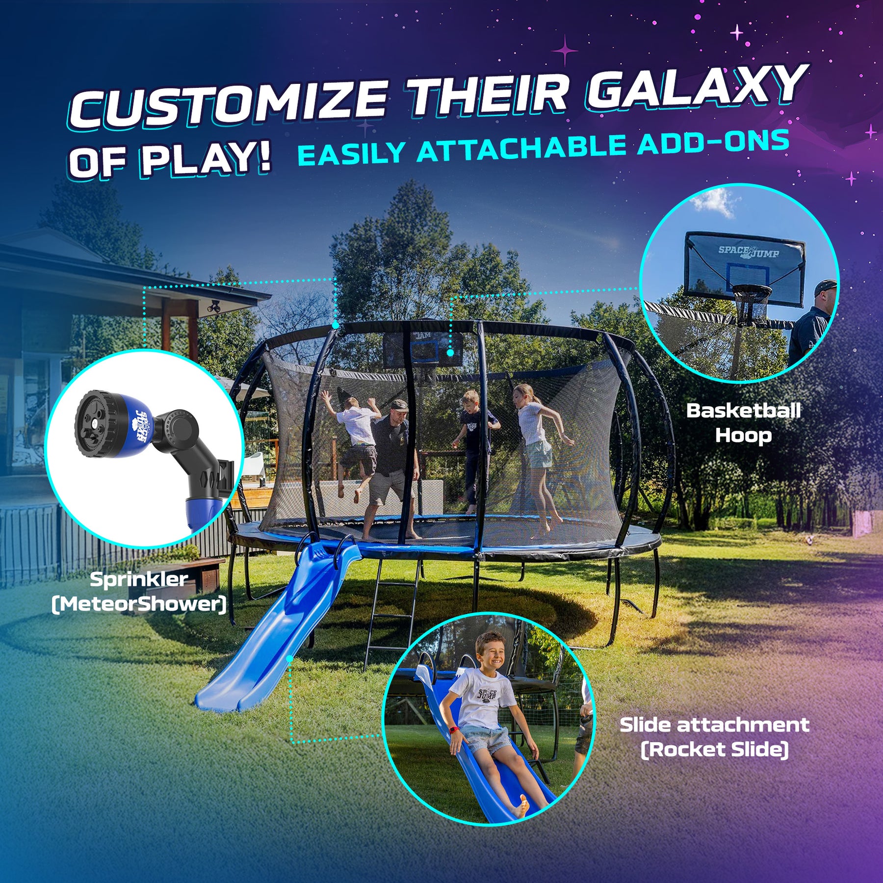 Surrounding the jump area is a tightly woven 360-degree infinity net, crafted from strong yet soft materials. This enclosure offers an added layer of safety and peace of mind by preventing accidental falls while maintaining clear sightlines and airflow. When you choose SpaceJump, you're not just getting a trampoline, you're joining the SpaceJump flight crew. That means we're here for you, for the long haul.
