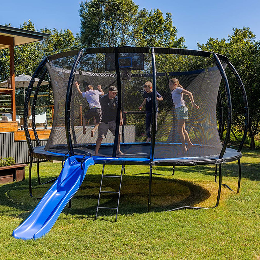- Bundle includes a basketball hoop, slide, and sprayer to add even more fun to your outdoor trampoline