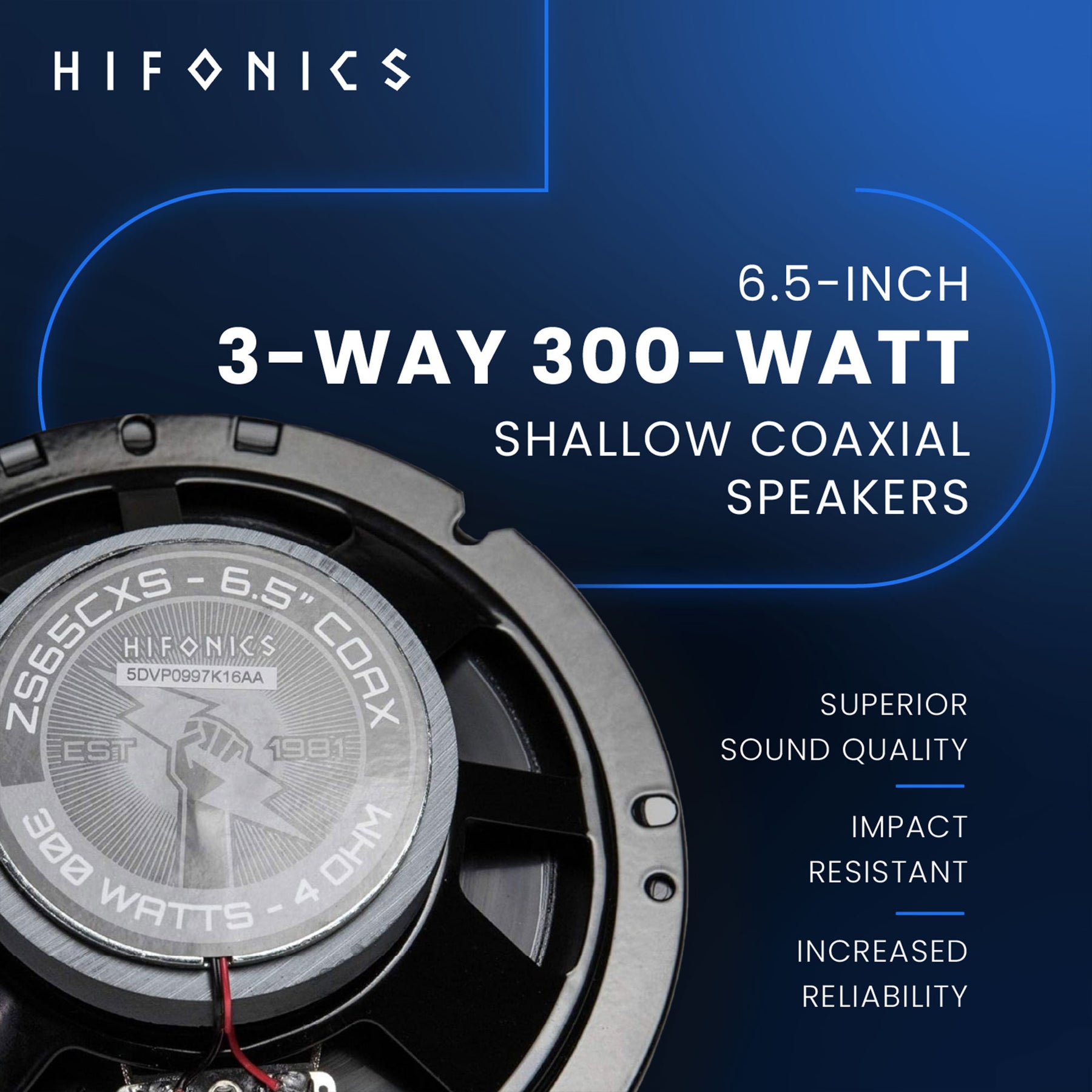 Amp up how you listen to your car's audio with a pair of the Hifonics Zeus ZS65CXS 6.5 Inch 3 Way 300W Shallow Mount Coaxial Speakers (4-pack).